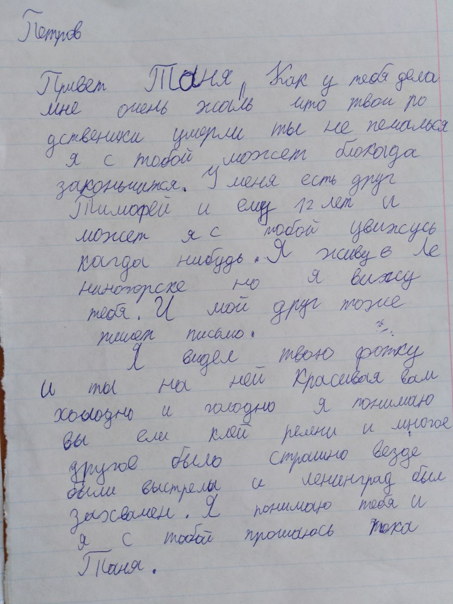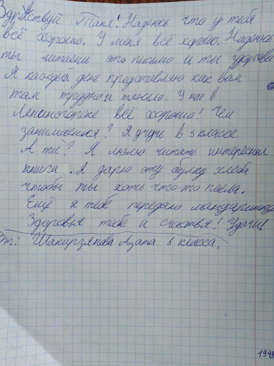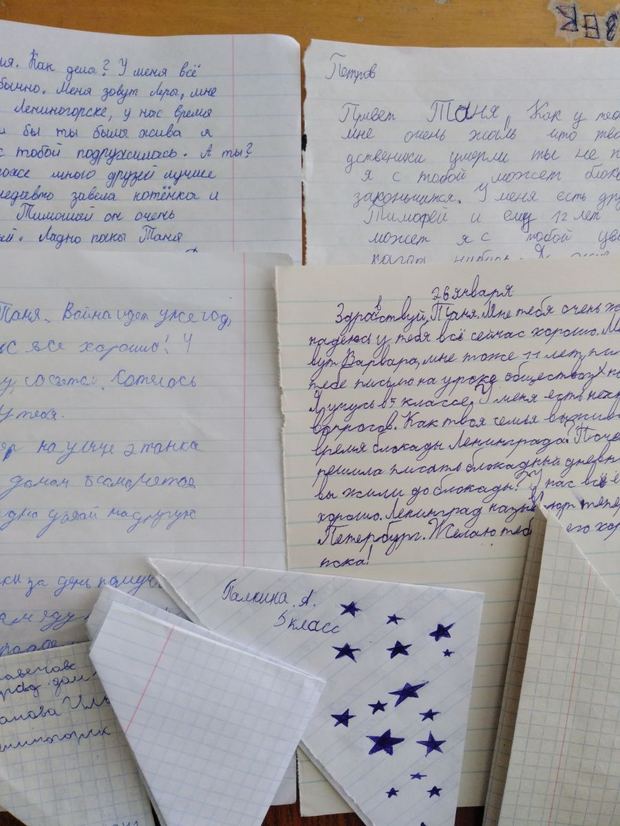 26 января учащиеся 5 класса приняли участие во Всероссийской акции "Блокадный хлеб", посмотрели фильм о тяжёлых годах жизни жителей Ленинграда во времена Великой Отечественной войны, написали трогательные письма Тани Савичевой, девочке пережившей голод и смерть родственников в блокадном городе. -
