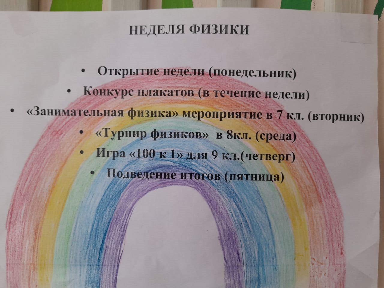 Вторая четверть в нашей школе началась с недели физики, эмблемой которой стала - Радуга. Главной идеей недели стали цвета радуги в элементах одежды.Объявлен конкурс рисунков для 5 - 8 классов, а для 7 - 9 классов будут проведены тематические внеклассные мероприятия. Ученики 5 - 7 классов приняли участие в "физическом" опросе. Также ученики 9 класса приняли участие в оформлении стенда. -