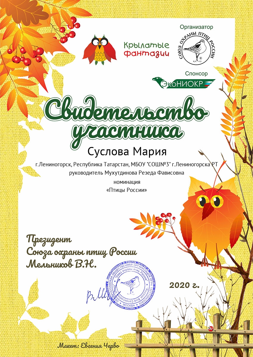 Союз охраны птиц России организовал VII интернет-конкурс поделок из природных материалов «Крылатые фантазии». Учащиеся 2 класса Шайдуллин Т. и Суслова М. приняли участие в номинации конкурса «Птицы России». -