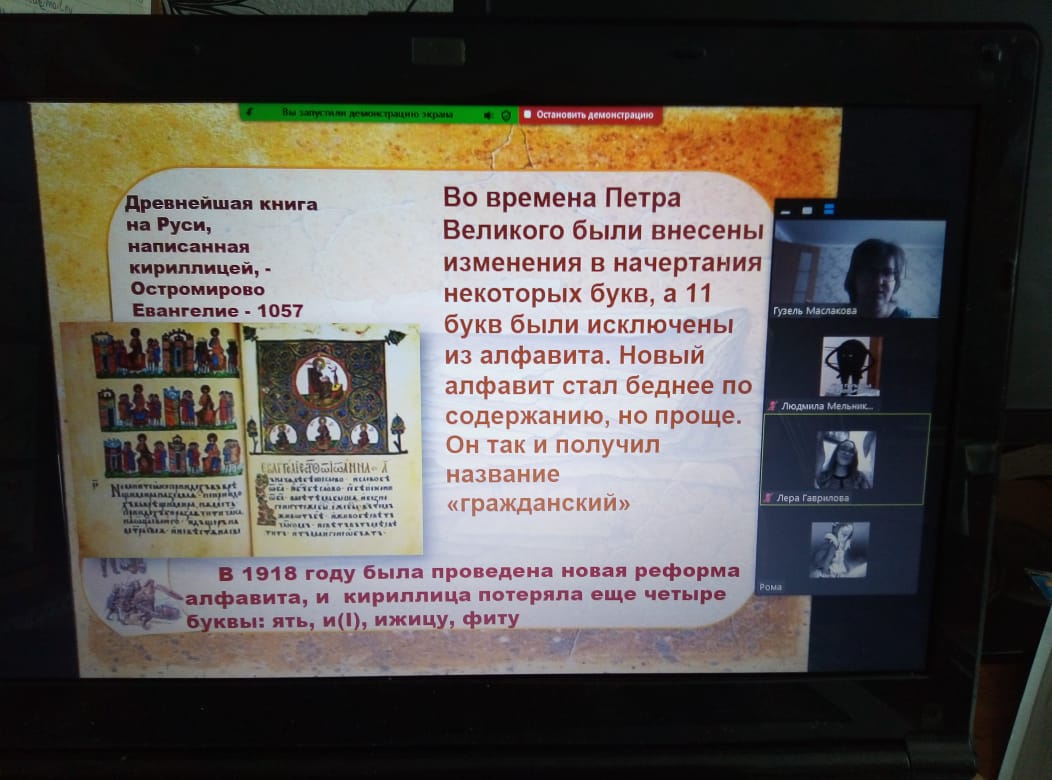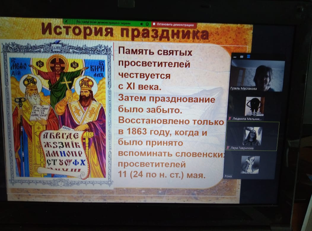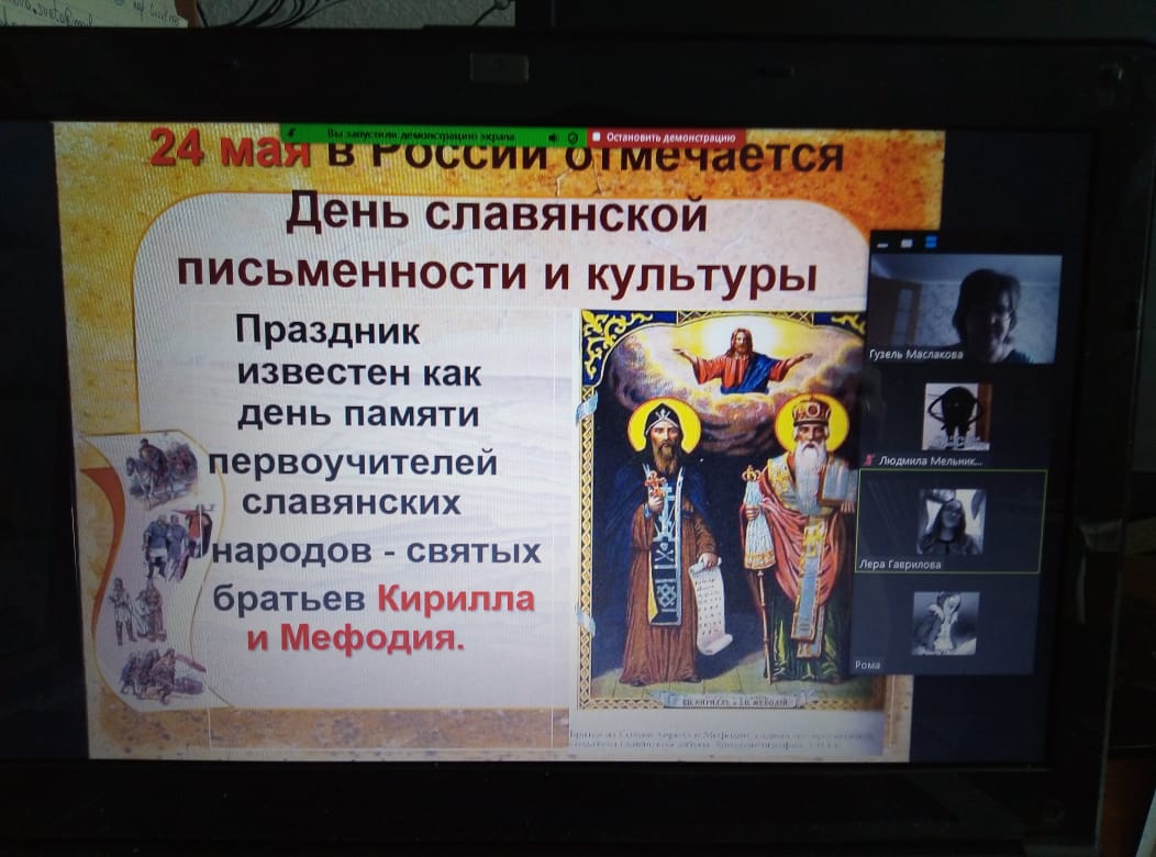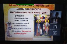 В 9 классе (учитель Маслакова Г. Я.) прошёл урок русского языка, посвящённый Дню славянской письменности и культуры. В ходе урока учащиеся изучили историю возникновения и развития русского алфавита, познакомились с заслугами в области культуры и образования братьев, святых Кирилла и Мефодия.