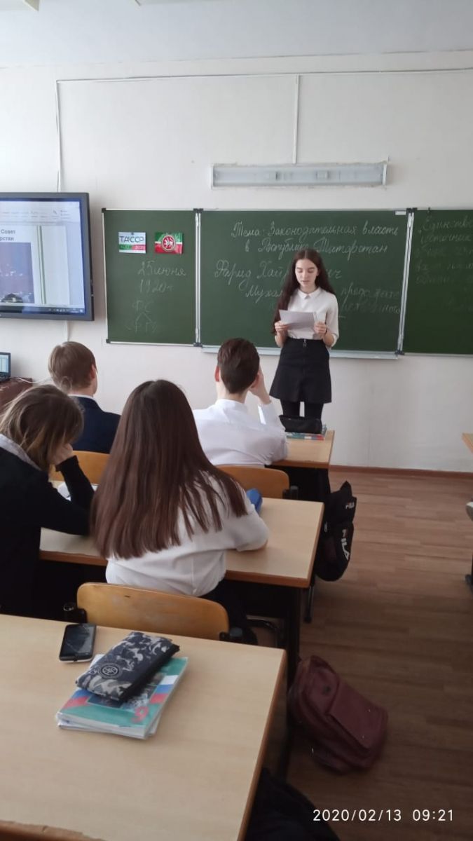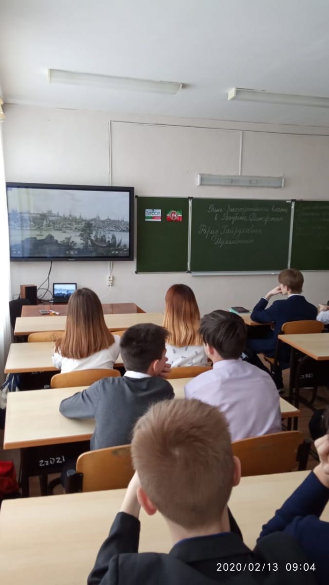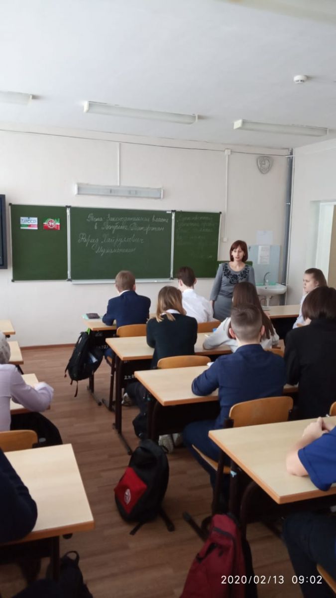 13 февраля для 8, 9 классов прошёл парламентский урок на тему Законодательная власть в Республике Татарстан. Учащиеся посмотрели фильм об образовании ТАССР, узнали о деятельности и функциях Государственного Совета Республики Татарстан.