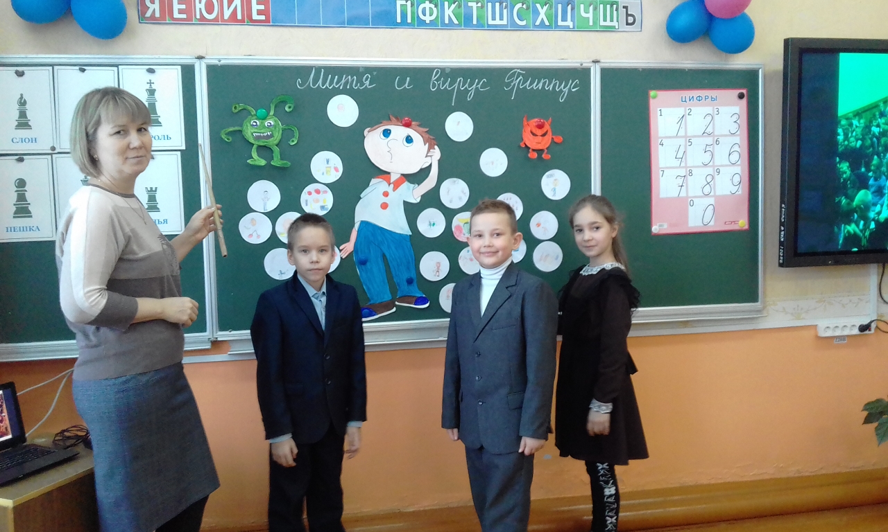 В 1 классе (кл. руководитель: Р.Ф.Мухутдинова) был проведён классный час на тему «Митя и вирус Гриппус».