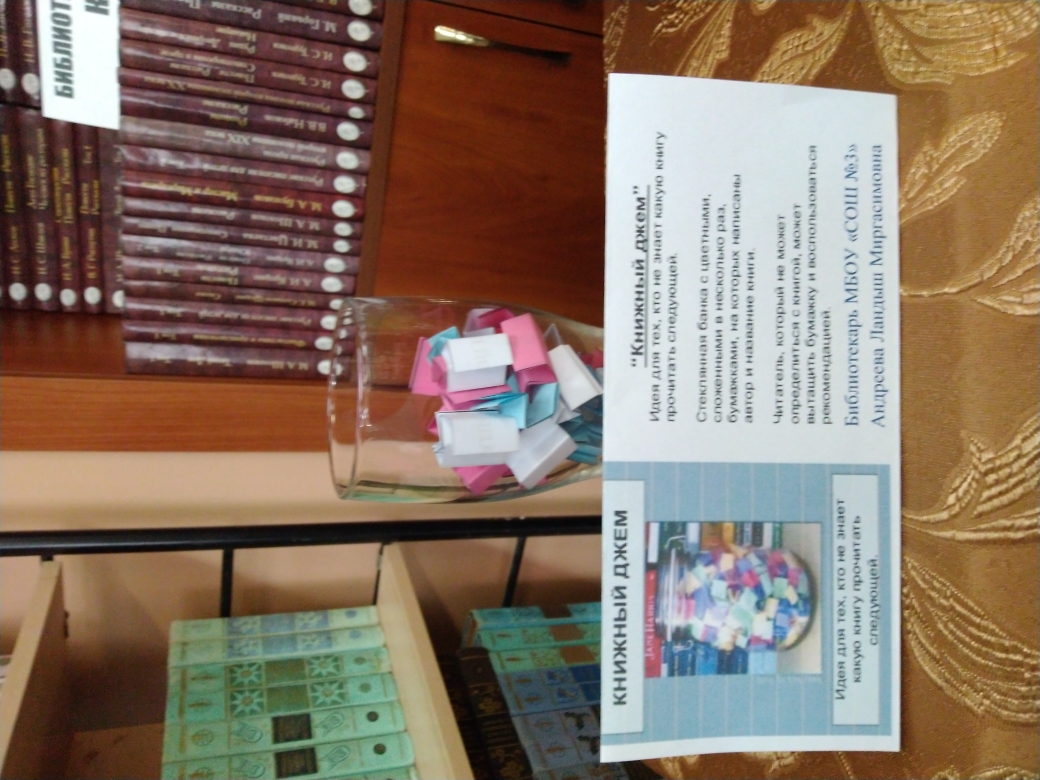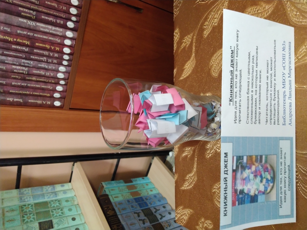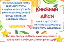 Порой юным читателям становится трудно сориентироваться в мире книг, и тогда на помощь приходит подсказка «Книжного джема»: из открытой баночки с яркой этикеткой нужно вытащить любую цветную бумажную звёздочку, на которой написаны автор и название книги. Каждый маленький читатель, пришедший в библиотеку, сможет найти для себя именно то, что нужно! Всех желающих отведать литературного угощения ждёт хорошее настроение, а самые активные читатели библиотеки будут приглашены на настоящее чаепитие с джемом и вареньем.