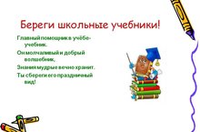 С 13 по 30 ноября в школе проходит акция «Береги учебник».Помни:«Учебник твой друг – без него, как без рук».Мы привыкли к книге, редко думаем о ней, как о замечательном сокровище, и бывает, что не всегда ценим и бережем ее. Книга – источник знаний, бодрости духа. Учебник- это тоже книга, только книга учебная. Как же живется ей?Дорогие ребята!Дают вам учебники в школах бесплатно.И это, конечно же, очень приятно.Но в этой приятности, что неприятно:Весною учебник сдается обратно…Памятка.«Как обращаться с учебником»:· Оберни учебник бумагой или вложи его в специальную обложку.· Не загибай страницы учебника, пользуйся закладкой.· Не перегибай учебник: от этого вырываются страницы.· Не закладывай ручку или карандаш в учебник: от этого ломается переплет.· Не пиши и не рисуй в учебниках. Помни: учебник – это общественная собственность.· Не бери учебник грязными руками и не читай его во время еды.· Клади учебник только на чистый стол или парту.· Не читай учебник на солнце: солнечные лучи обесцвечивают обложку и страницы книги.· Перевертывая страницу, держи её за верхний угол.Правила обращения с книгой.1. Книга не должна мокнуть, от этого коробятся страницы, разбухает и расслаивается переплет.2. Когда идешь в библиотеку. положи книгу в пакет, который защитит её от дождя.3. Книга боится рассыпаться на отдельные листочки. Не бросай раскрытую книгу вверх переплетом, не загибай страниц.,, пользуйся закладкой.4. Если хочешь нарисовать что-то или записать, когда прочитал книгу, сделай это в альбоме или в специальной тетради.5. Не разбрасывай книги – ты можешь их потерять, их может погрызть собака, разорвать страницы котенок. -