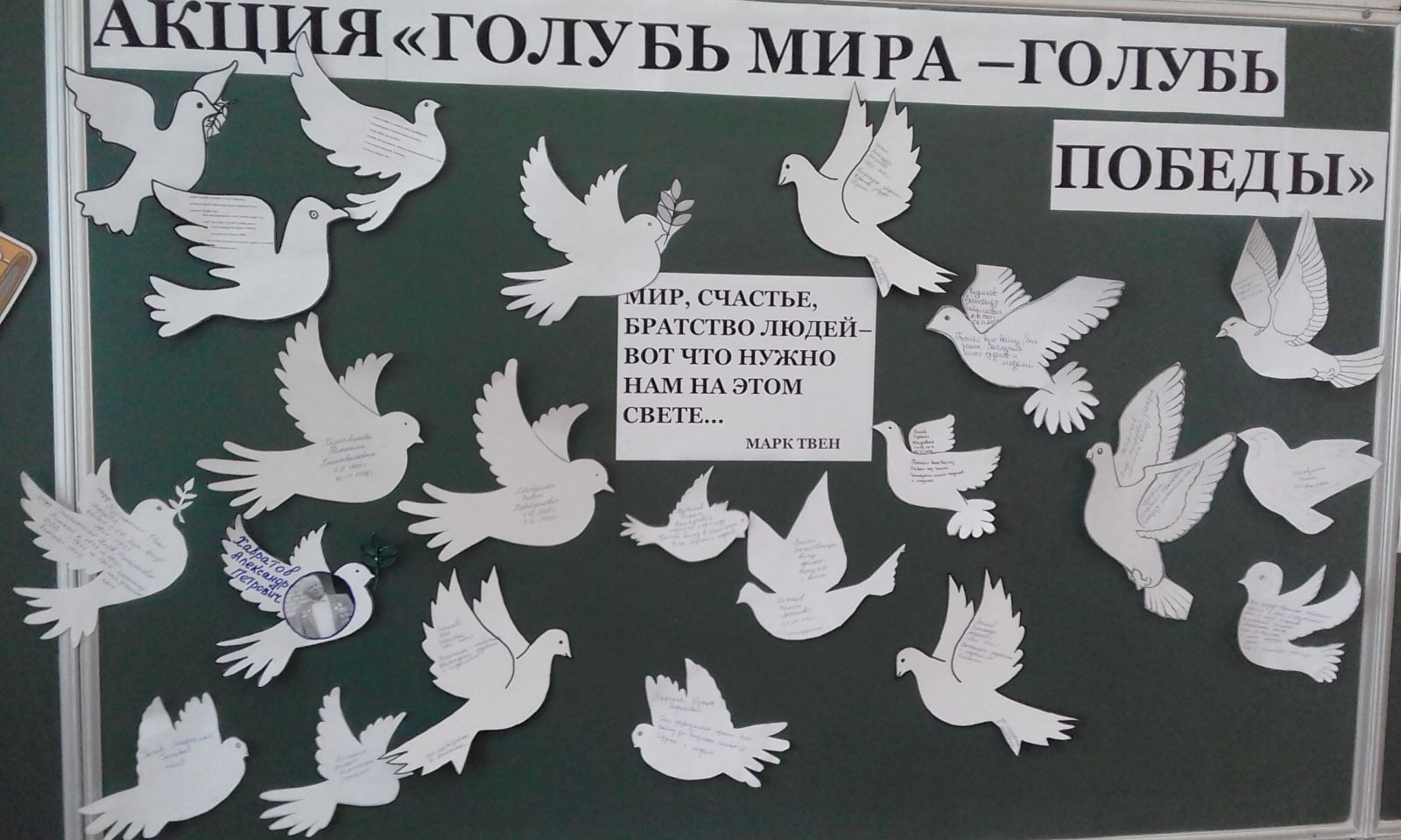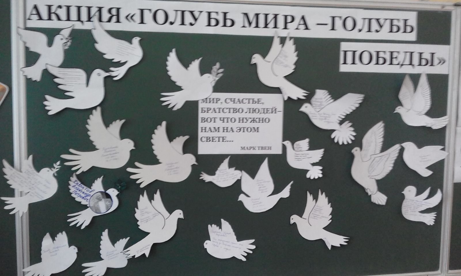 В преддверии Международного дня мира учащиеся 1 класса приняли участие в акции «Голубь мира», цель которой: укрепление идеалов мира, гражданско-патриотического, духовно-нравственного самосознания и мышления школьников, развитие патриотических ценностей и чувства уважения к героическому прошлому России. Классный руководитель акцентировала внимание учащихся на важности сохранения мира на Земле, говорили о героизме и мужестве тех, кто отдал свою жизнь, защищая мир, в ходе военных действий в разные периоды истории нашей страны.Белый голубь, символ мира,Ты взлети на шар земной!Катастрофы, беды, войныПусть обходят сторонойТу прекрасную планету,Что дала нам всем приют,Отдала озёра, реки,Душу отдала свою...Люди мира заклинают:Мир прекрасный, сохранись!Так лети же, Белый Голубь,Никогда не падай вниз. -