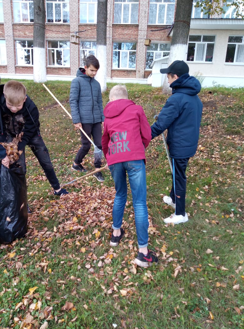 Каждый вторник учащиеся нашей школы выходят на уборку пришкольной территории. Сегодня ребята 8 класса собирали опавшую листву, крупный мусор.