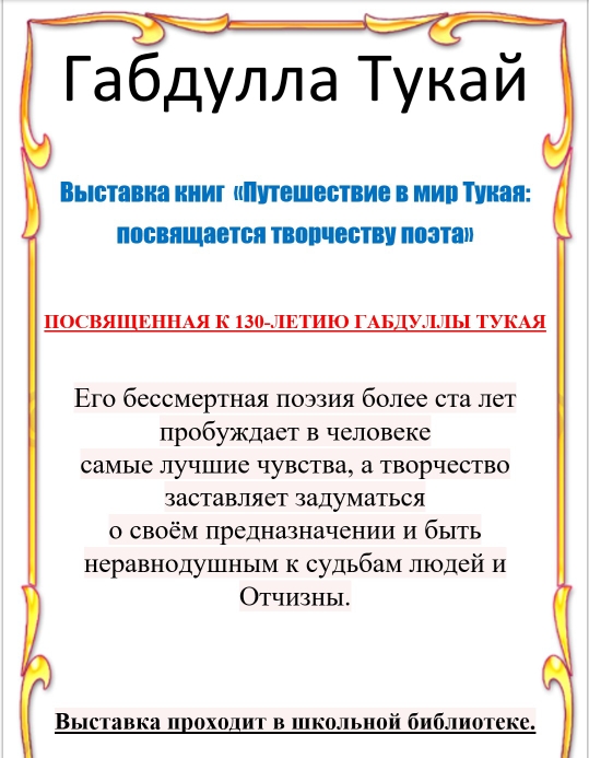 В школьной библиотеке проходит выставка книг Габдуллы Тукая.Его бессмертная поэзия более ста лет пробуждает в человеке самые лучшие чувства, а творчество заставляет задуматься о своём предназначении и быть неравнодушным к судьбам людей и Отчизны.Габдулла Тукай вошел в историю татарской литературы как великий народный поэт, заложивший основу национальной поэзии и создавший ее классический стиль. В истории татарской культуры имя Тукая занимает особое место, сопоставимое со значением Пушкина для русской культуры. Моя душа сходна с тобой, о Пушкин вдохновенный, Неподражаемый поэт, единый во вселенной!... …Моя душа сходна с твоей, но силы несравнимы. О, как мне мощь твоя нужна, певец неповторимый! 1906 г. (Пер. Л. Климовой) -