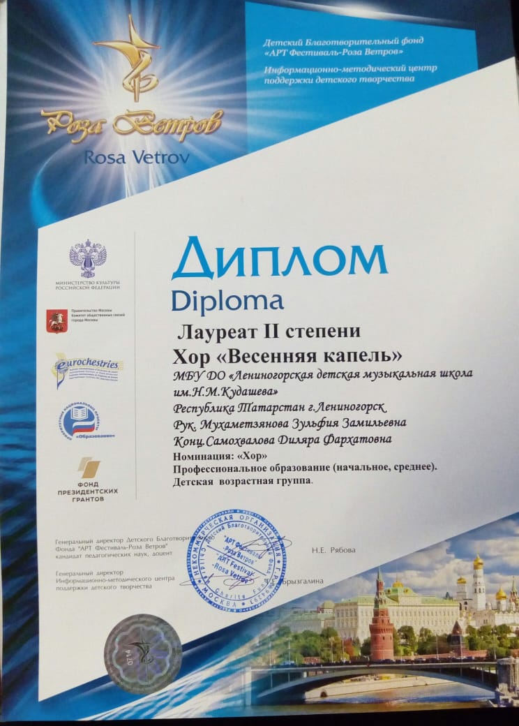 Хор "Весенняя капель" МБУ ДО ""Лениногорская детская музыкальная школа имени Н. М. Кудашева" Республики Татарстан г. Лениногорск стала лауреатом II степени в "АРТ Фестивале - Роза Ветров". Ученица 4 класса Лопатова Карина участница конкурса.