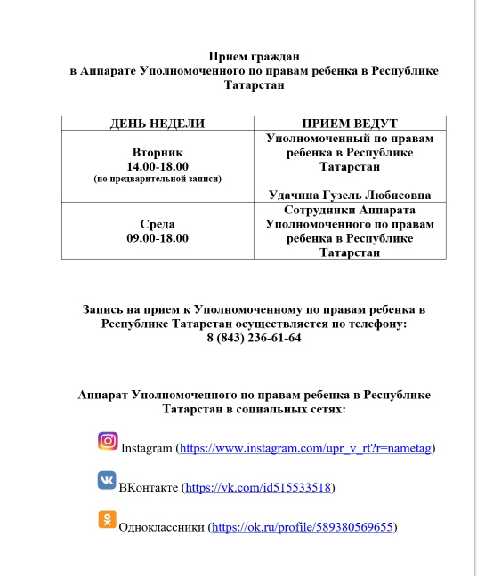Аппарат Уполномоченного по правам ребенкав Республике Татарстан в социальных сетях:InstagramВКонтактеОдноклассники -