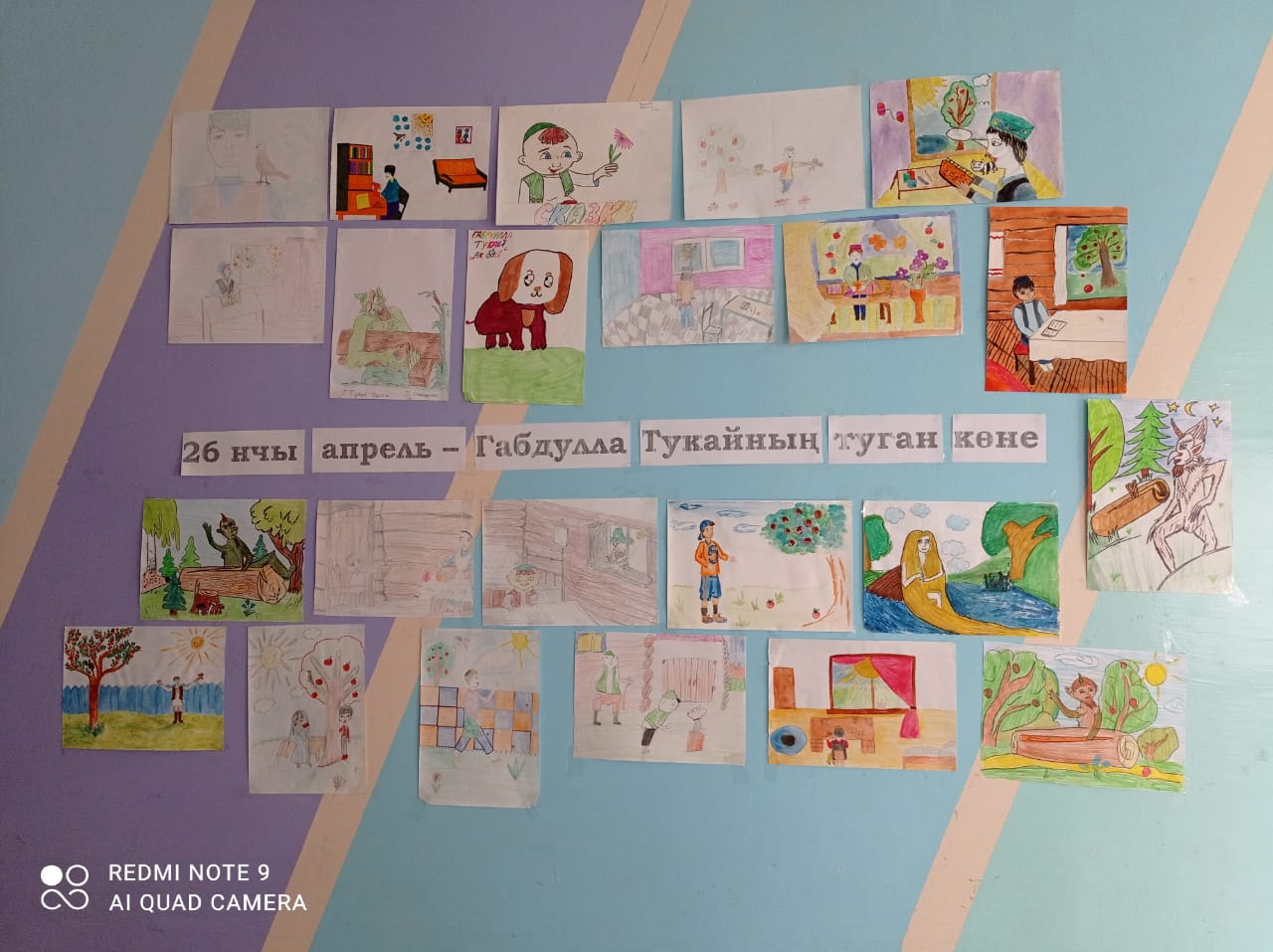 Мәктәптә Тукай атналыгы дәвам итә. Әдип әсәрләренә иллюстрацияләр 5-7 сыйныф укучылары тарафыннан эшләнде. Бүген, халыкның яраткан шагыйре туган көнендә, 5 сыйныф укучыларын мәктән китапханәчесе Андреева Л.М. чакырды. Күргәзмә белән танышып, Тукай шигырьләрен сөйләп, рәсемнәр буенча әсәрләрен танып вакытның үткәне дә сизелмәде.В школе продолжается неделя Тукая. Иллюстрации к произведениям писателя были сделаны учениками 5-7 классов. Сегодня, в день рождения любимого народом поэта, учащихся 5 класса пригласила библиотекарь Андреева Л. М. Знакомясь с выставкой, рассказывая стихи Тукая, узнавали произведения по рисункам. -