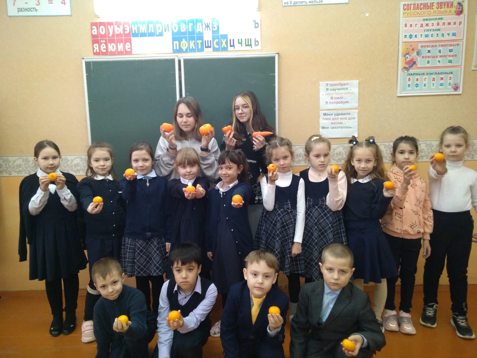 С понедельника в школе проводится «Цветная неделя», где каждый день недели посвящен какому - либо цвету, открыли ее оранжевым цветом учащиеся 7 класса. Они провели в первом классе «Оранжевый урок», первоклассники отгадывали загадки об оранжевых фруктах и овощах, вспоминали песни, где упоминается этот цвет. Активно участвовали все ребята, за что и получили каждый по оранжевому фрукту. -