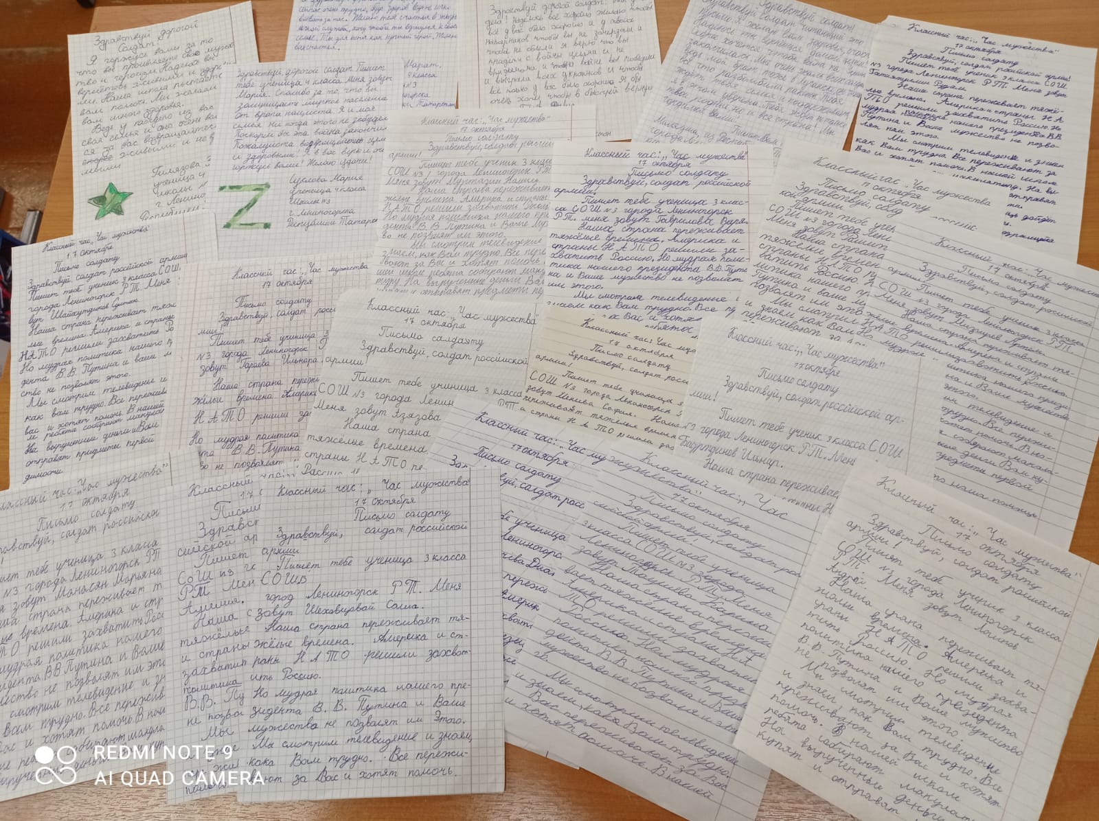 17 октября с целью ознакомления обучающихся с примерами героизма и мужества различных поколений защитников Отечества, оказания поддержки участникам специальной военной операции, а также мобилизованным военнослужащим, проходящим подготовку и боевое слаживание, в школе во всех классах были проведены открытые «УРОКИ МУЖЕСТВА» И ВСЕРОССИЙСКАЯ АКЦИЯ «ПИСЬМО СОЛДАТУ». Учащиеся узнали порядок написания и оформления писем военнослужащим, и написали письма поддержки военнослужащим Вооруженных Сил. -