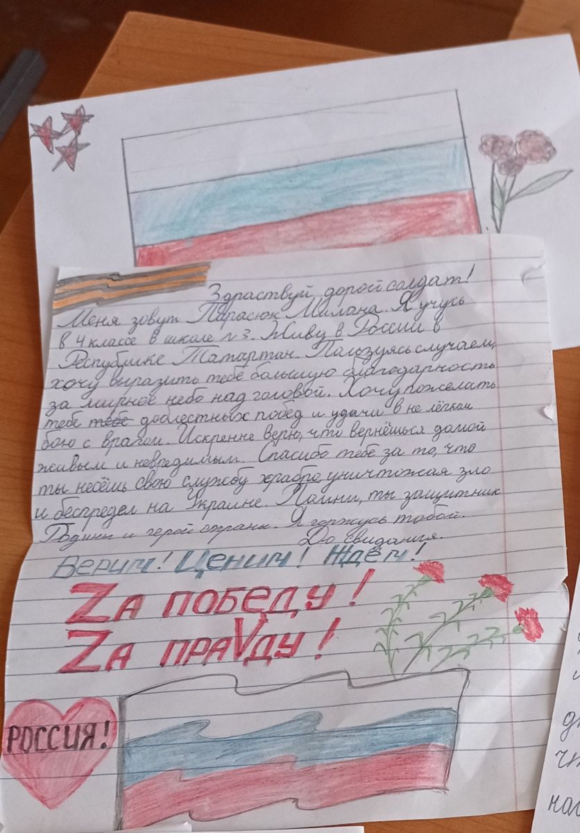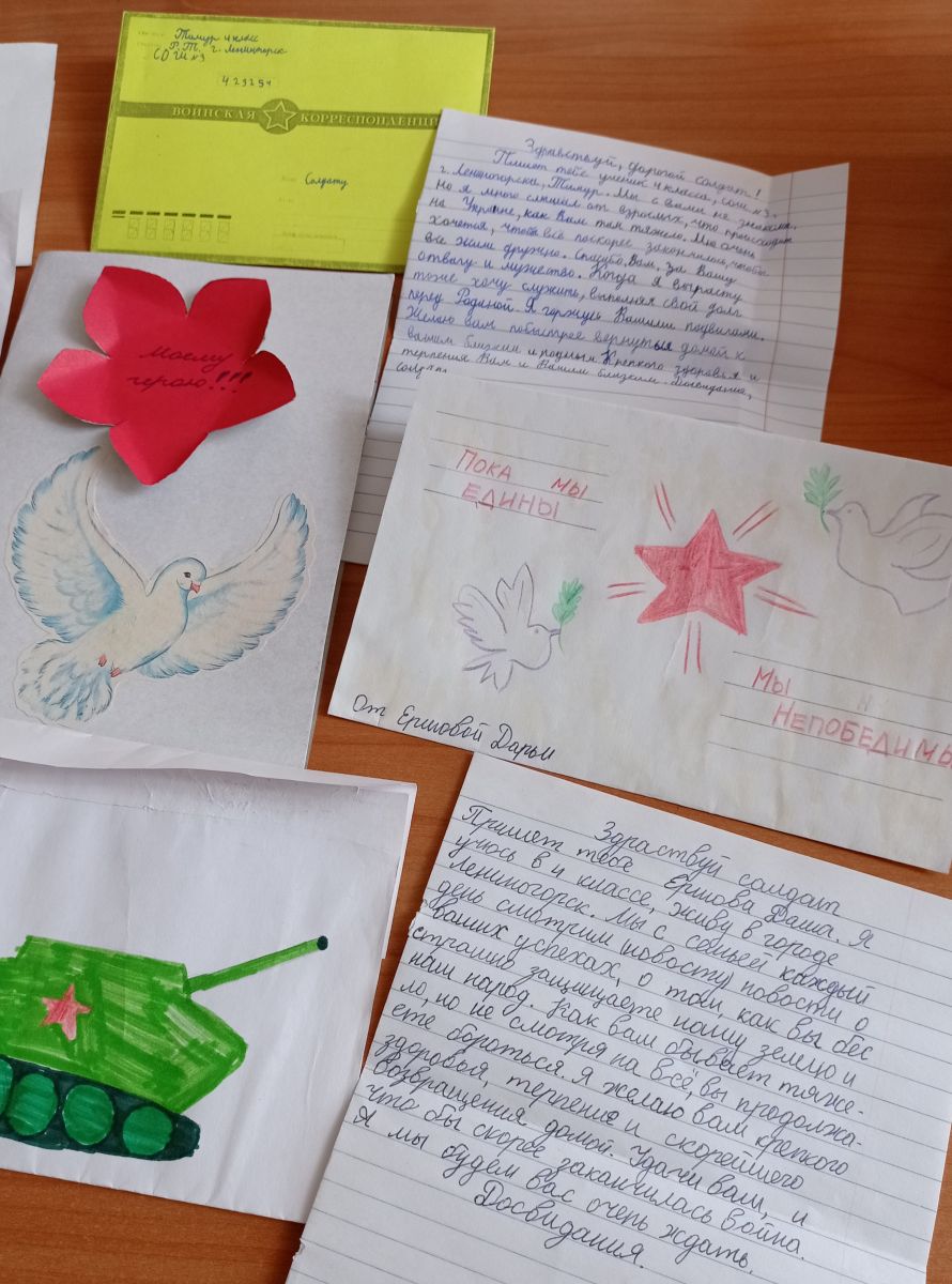 Учащиеся 4 класса приняли участие во Всероссийской акции «ПИСЬМО СОЛДАТУ», которые сопереживают и пишут доблестным солдатам свои пожелания, которые сегодня выполняют служебно-боевые задачи на территории Украины.Самое ценное, что ребята школьного возраста осознают, насколько важна поддержка для человека, находящегося вдали от дома. Для тех, кто днем и ночью несет свою нелегкую службу. -