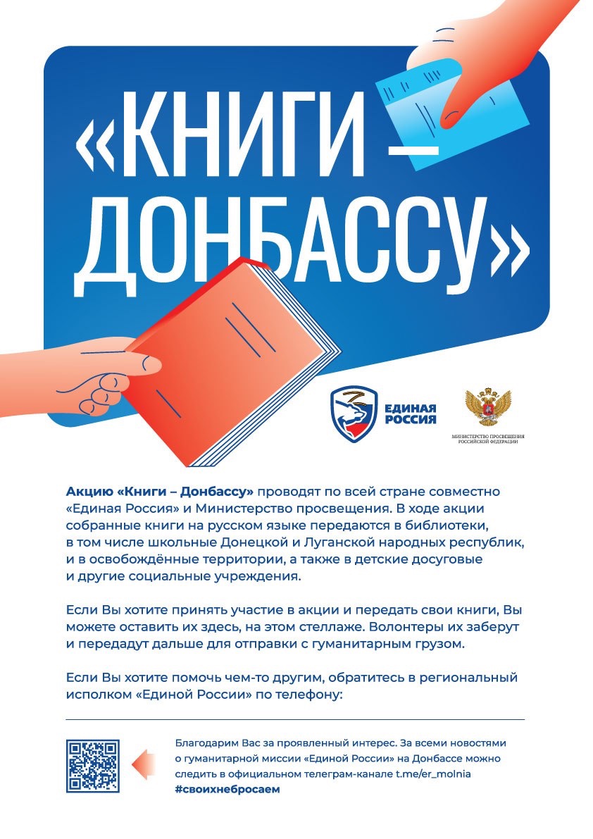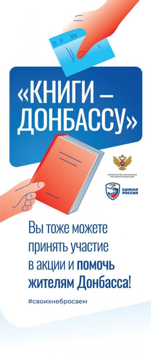 Акцию «Книгу – Донбассу» проводят по всей стране совместно «Единая Россия» и Министерство просвещения. Входе акции собрание книг на русском языке передаются в библиотеки, в том числе школьные Донецкой и Луганской народных республик, и в освобождённые территории, а также в детские досуговые и другие социальные учреждения.Просим Вас поддержать данную акцию по сбору книг на русском языке для последующей отправки в Луганскую и Донецкую Народные Республики.Даты проведения акции : с 12 по 22 августа 2022 года. Пункт приема книг – г. Лениногорск, ул. Куйбышева , д.21, по всем возникающим вопросам обращаться в Лениногорское местное отделение Партии «ЕДИНАЯ РОССИЯ» -8 (85595) 5-16-11, 8 (85595) 5-25-89 -