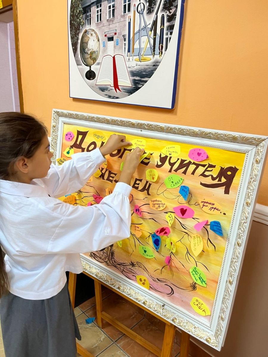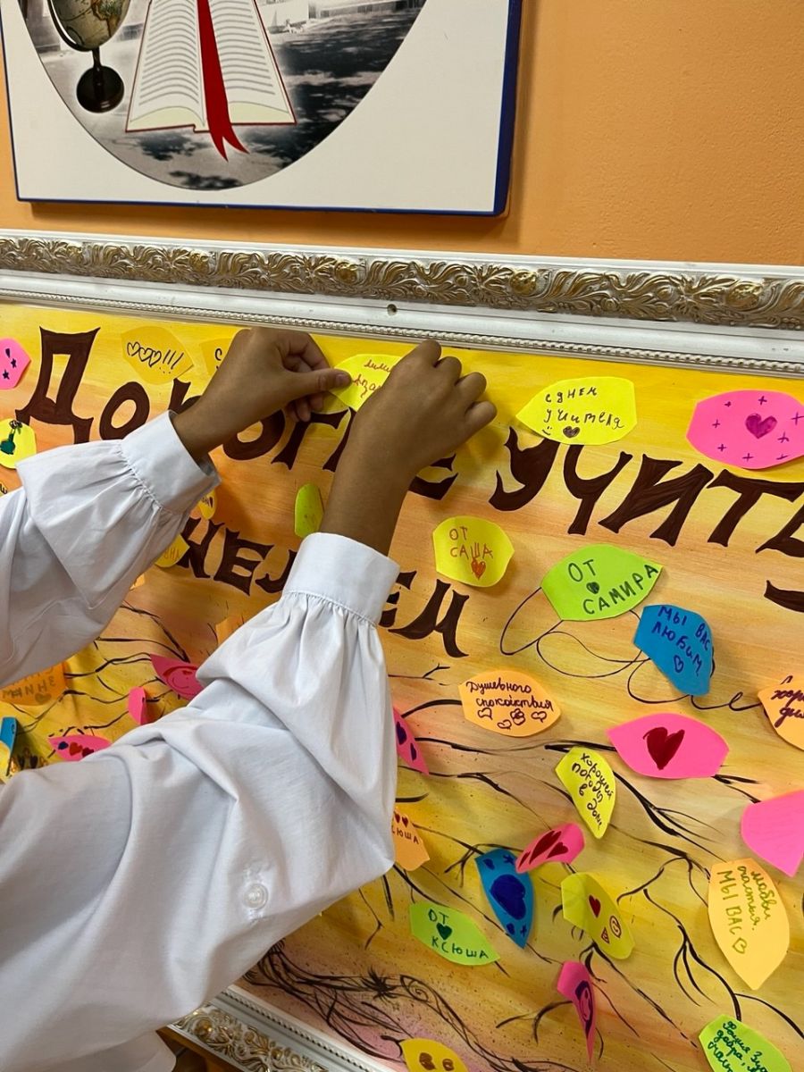 Ребята с первичного отделения школы создали панно "Дорогие учителя, мы желаем Вам..." с деревом пожеланий для своих любимых учителей. Каждый ученик смог написать на стикере свое пожелание и прикрепить к веточки дерева.