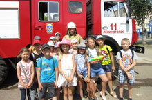 Учащиеся пришкольного лагеря посетили пожарную часть. Ведущий экскурсии рассказал о профессии пожарника, о том какую помощь они оказывают населению.