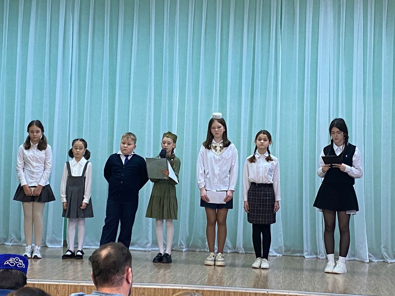 Укучылар районыбызның һәм Әлмәт шәһәренең атаклы шәхесләре белән таныштылар, аларның шигырьләрен тыңладылар. Шулай ук кичәдә укучылар да үз шигырьләрен сөйләделәр. 4А сыйныфы укучысы Зиятдинова Зилә дә “Җиңү юбилее белән!” исемле үзе язган шигырен сөйләде. Остазларыбыз Зиләнең шигырен бик хупладылар һәм Зиләгә уңышлар теләделәр.