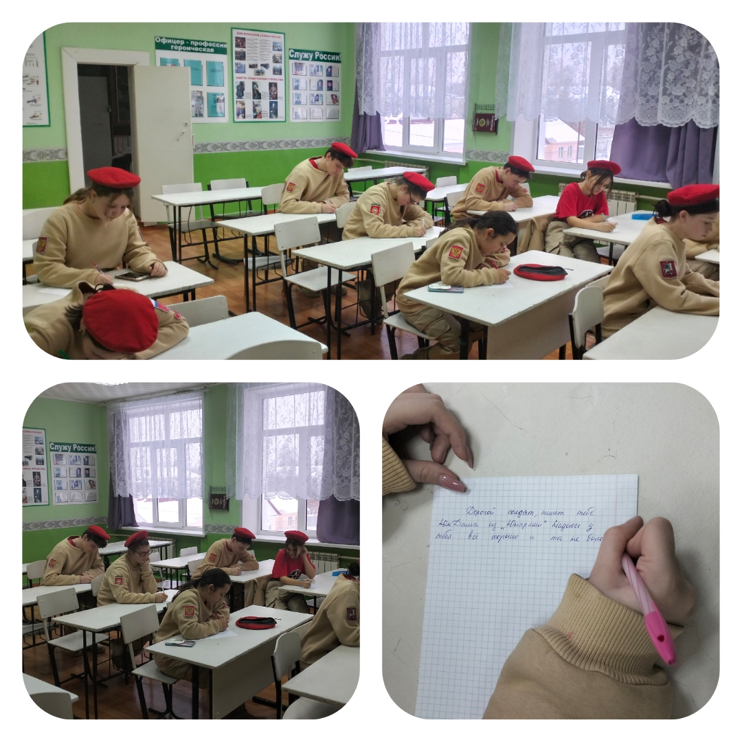 В нашей школе прошла акция «Письмо Солдату», в рамках которой, ЮнАрмейцы писали письма воинам, принимающим участие в спецоперации вооруженных сил России на Украине.Добрые слова поддержки, рисунки, в которых прорисовываются главные символы спецоперации – «Z и V - значит Победа», «Своих не бросаем».Цель акции - формирование уважительного отношения подрастающего поколения к мужеству и героизму наших солдат.