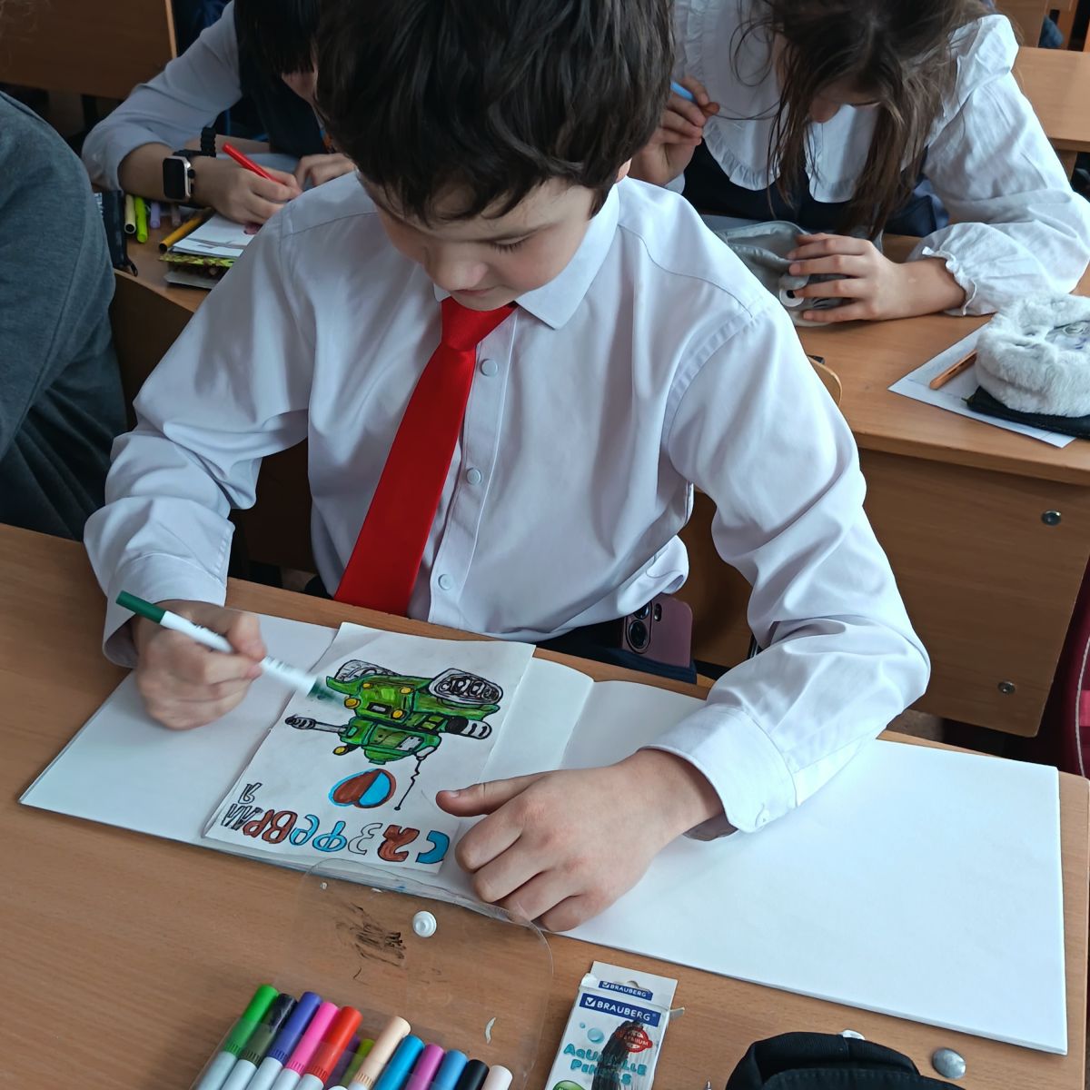 Опубликовано: 11.02.2026Ученики 4 Б класса создали открытки для военнослужащих, участвующих в специальной военной операции.
