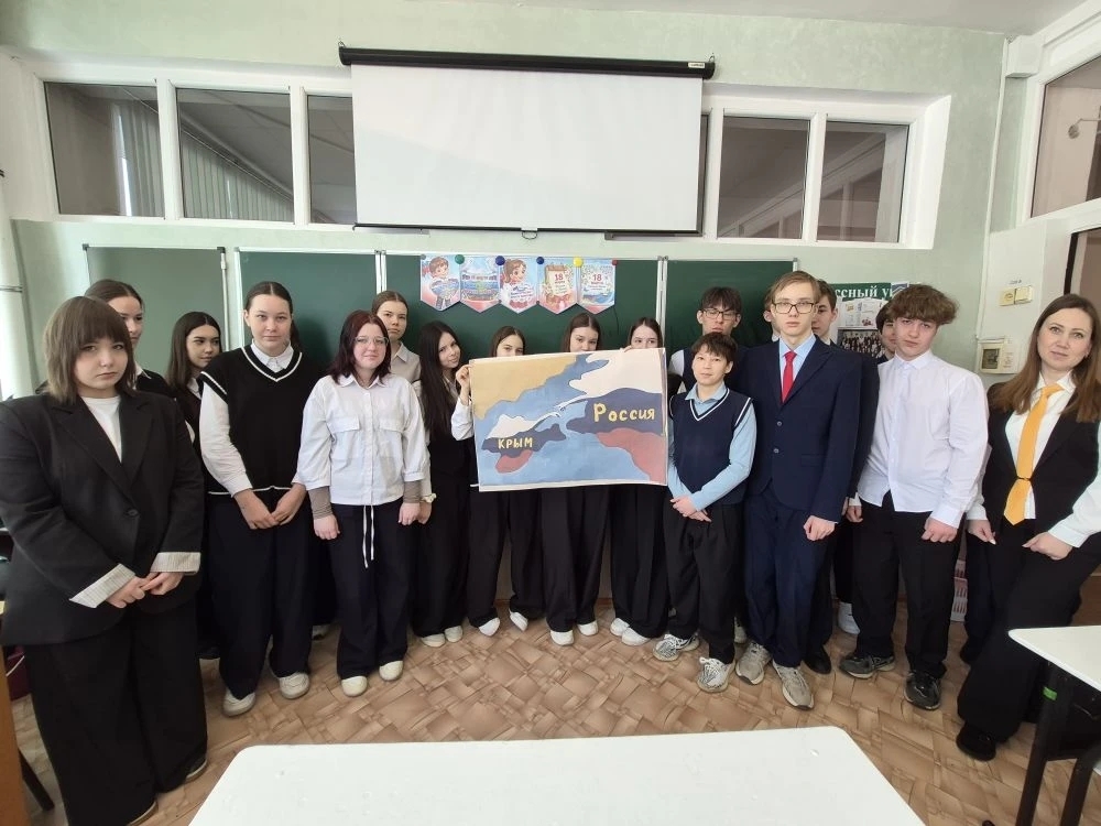 В преддверии празднования данного события, советником директора по воспитанию нашей школы, были проведены мероприятия, такие как: викторина «Одна страна», творческое мероприятие по созданию плаката, изготовление и раздача листовок с информационным блоком «Крым-это?». Целью события было, понимать важность сохранения единства русских земель, сохранение исторических границ, сопричастность к прошлому, настоящему и будущему народов России