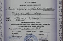 - 2 нче урын - “Җәлил рус телендә” номинациясе 9 яшьтән 13 яшькә кадәр (кертеп): Блажнова Ксения (җитәкче Якупова Й.Г.);