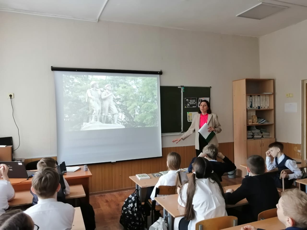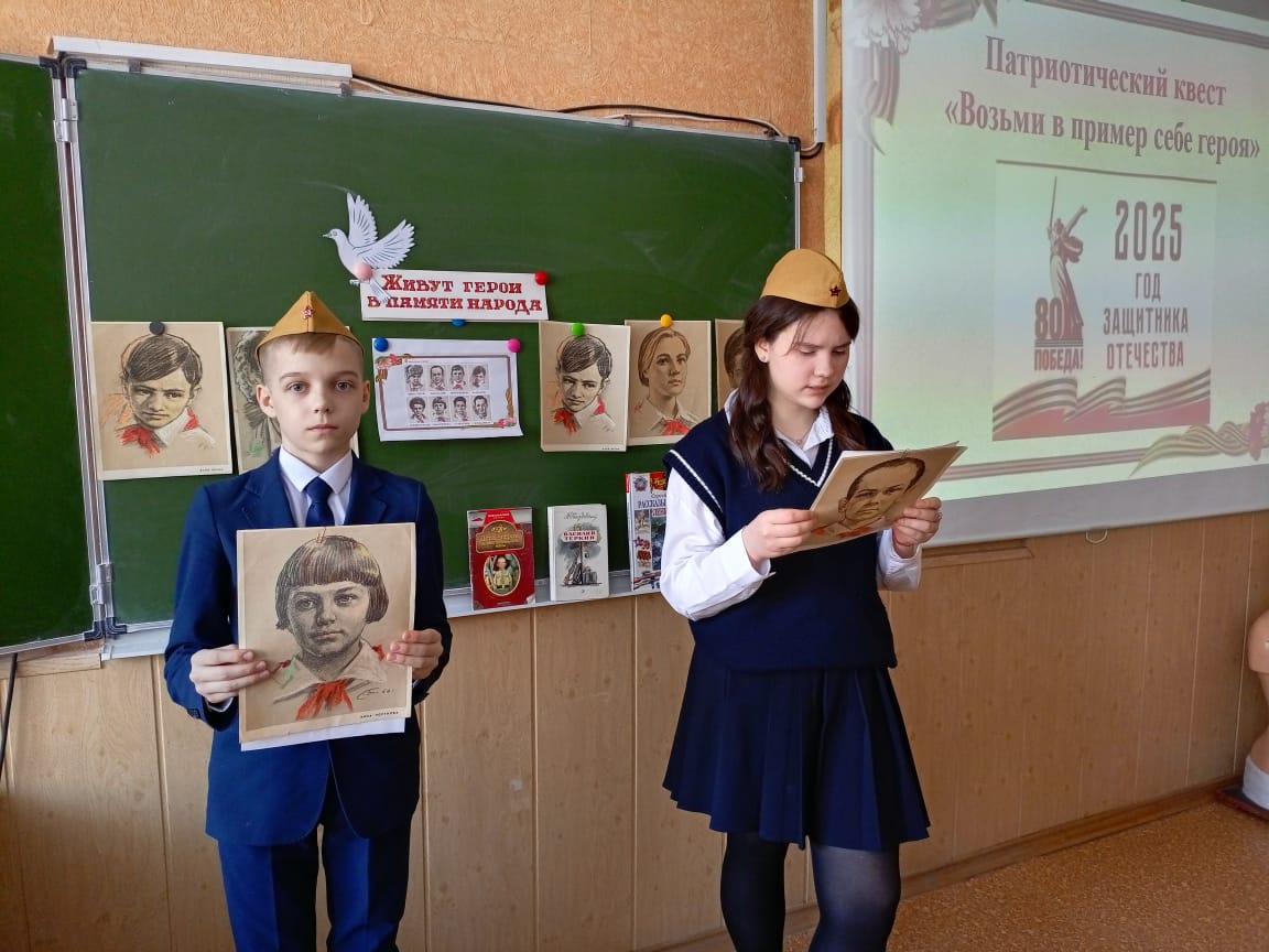 В рамках Недели детской и юношеской книги библиотекари Центральной городской детской библиотеки им. Ю. Гагарина для учащихся 7 В класса провели патриотический квест «Возьми в пример себе героя». Ребята узнали о пионерах – героях Советского Союза: Зине Портновой, Лене Голикове, Володе Дубинине, Вале Котик, об их подвигах во время Великой Отечественной войны, разгадывали кроссворд, отвечали на вопросы викторины, познакомились с книжной выставкой «Живут герои в памяти народа», на которой были представлены произведения детской литературы о Великой Отечественной войне.
