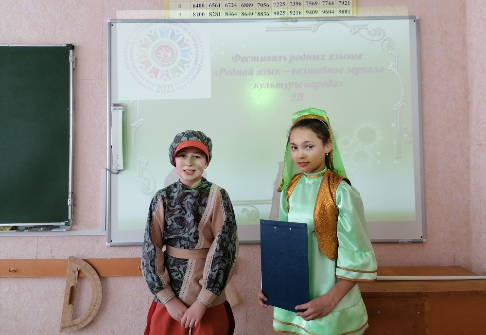 Туган телләр һәм Халыклар бердәмлеге елына багышланган гомуммәктәп декадасы кысаларында 5 «В» сыйныфында «Туган Тел – халык мәдәниятенең тылсымлы көзгесе» фестивале узды. Алып баручылар балаларны туган тел көне тарихы (21нче февраль), аның максатлары һәм бурычлары белән таныштырдылар. Балалар танылган кешеләрнең туган телнең мөһимлеге һәм әһәмияте турында әйткән сүзләрен укыдылар. Рус теленең «чисталыгы» борчу тудыра. Күп кенә сүзләр заманча сүзләр белән алмаштырылып килә. Шулай итеп, Некрасовның заманча язылган шигырен укып, балалар аның эчтәлекле, якты булмавы турында нәтиҗә ясадылар. Чара ахырында балалар «Мәкальне әйтеп бетер" дигән уенын уйнадылар, мәкальләр төзеделәр, рус телен белүдә ярыштылар, табышмакларга җавап бирделәр.
