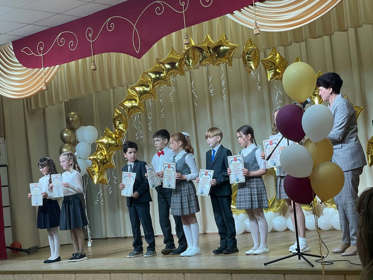 На празднике звучали песни и стихи в исполнении ребят. Директор школы Ольга Геннадьевна поздравила ребят и их родителей с окончанием начальной школы. С ответным словом выступили родители школьников. В своём выступлении они сказали слова благодарности всем учителям, преподававшим в их классе, администрации школы, а также обратились к своим любимым деткам с напутственным словом.