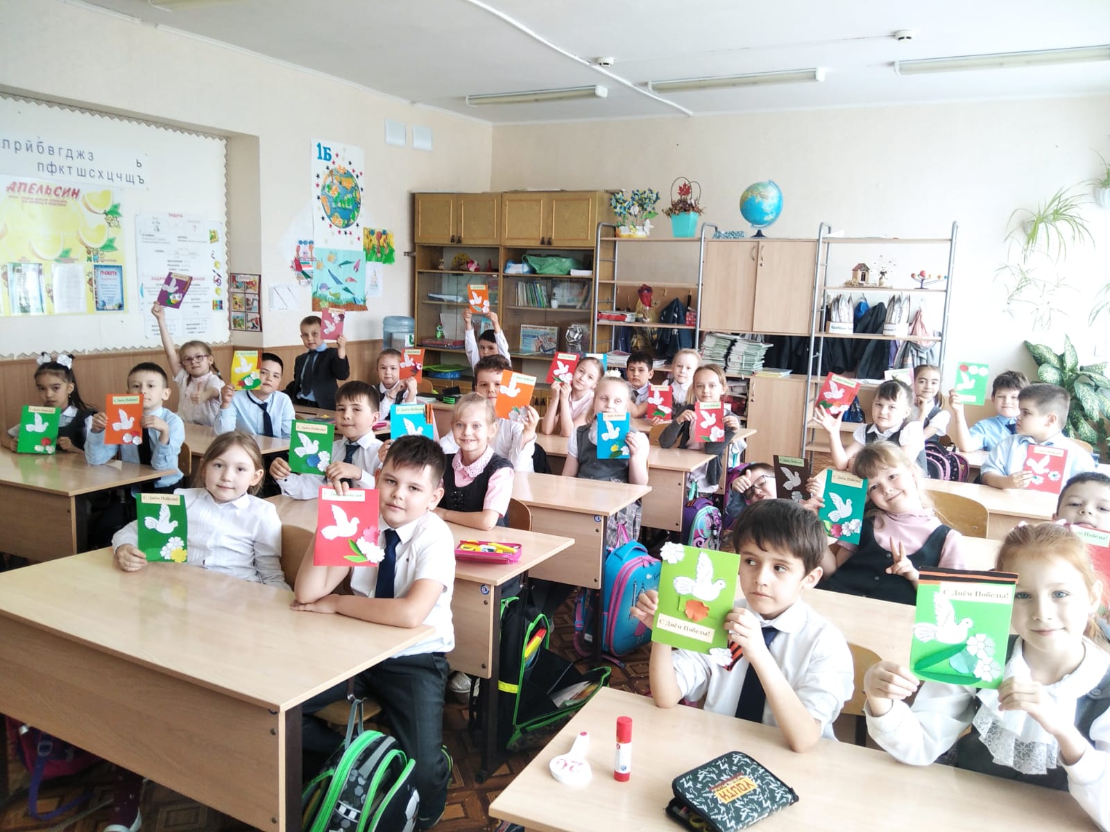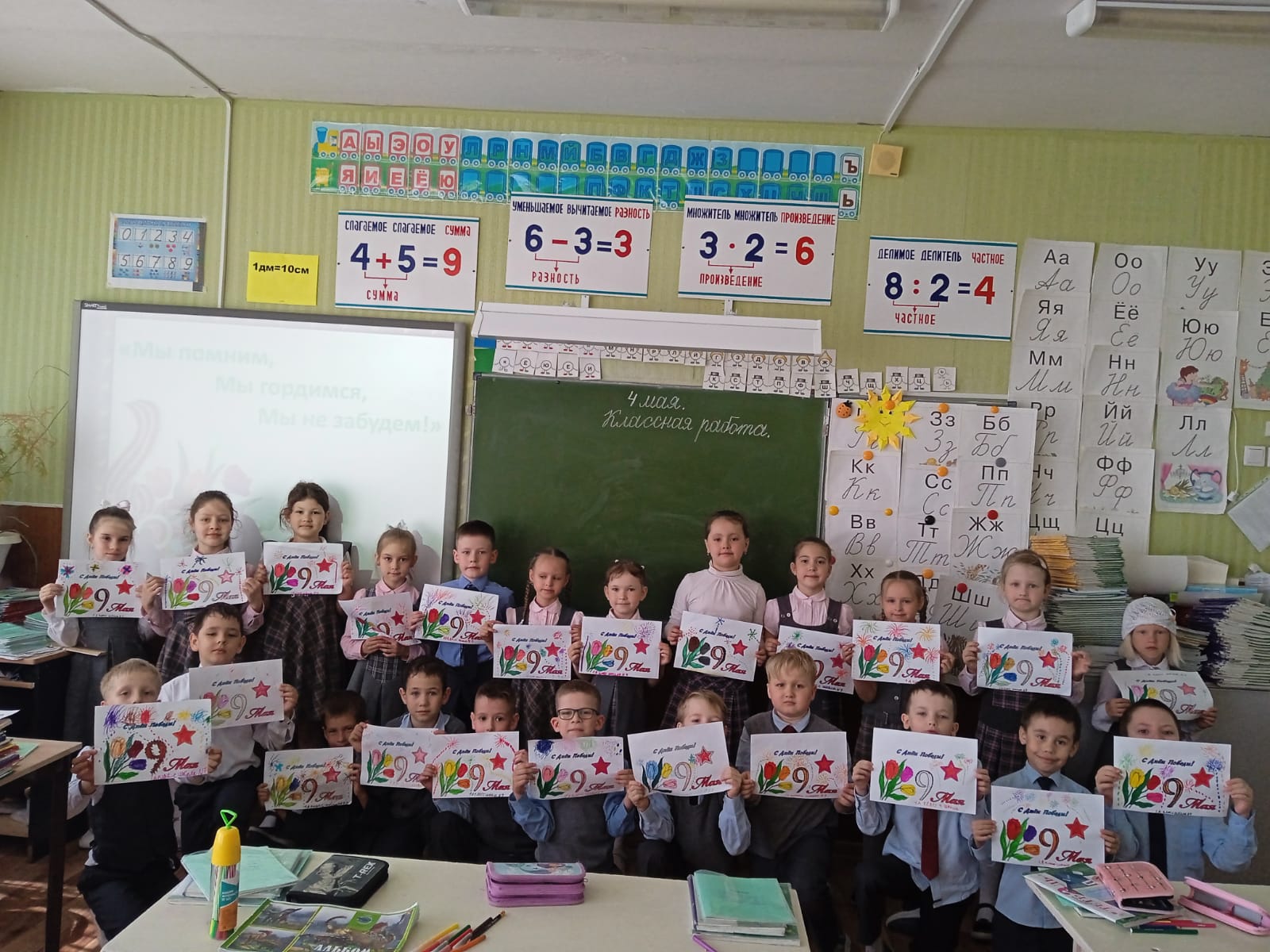 На кануне Великого праздника - Дня Победы в 1 А классе проведён классный час, где ребята говорили о том, какой ценой досталась победа нашим прадедам и прабабушкам. Всё дальше уходит ВОВ, уходят люди, которые помнят эту войну. Но память о подвиге нашего народа будет жить вечно. Ребята нарисовали открытки и развесили их в своих дворах.