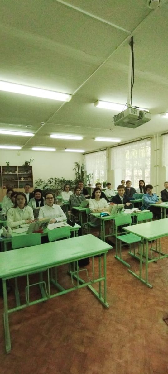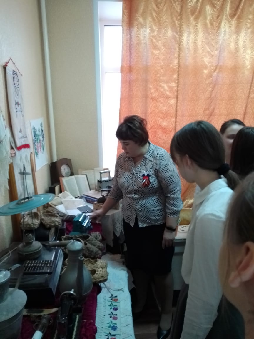 Учащиеся 8б класса посетили школьный музей. Руководитель музея, Блинова О. В., рассказала ребятам об основных событиях Великой Отечественной войны, продемонстрировала экспонаты музея, связанные с военными событиями. Также вспомнили о героях СССР - наших земляках.