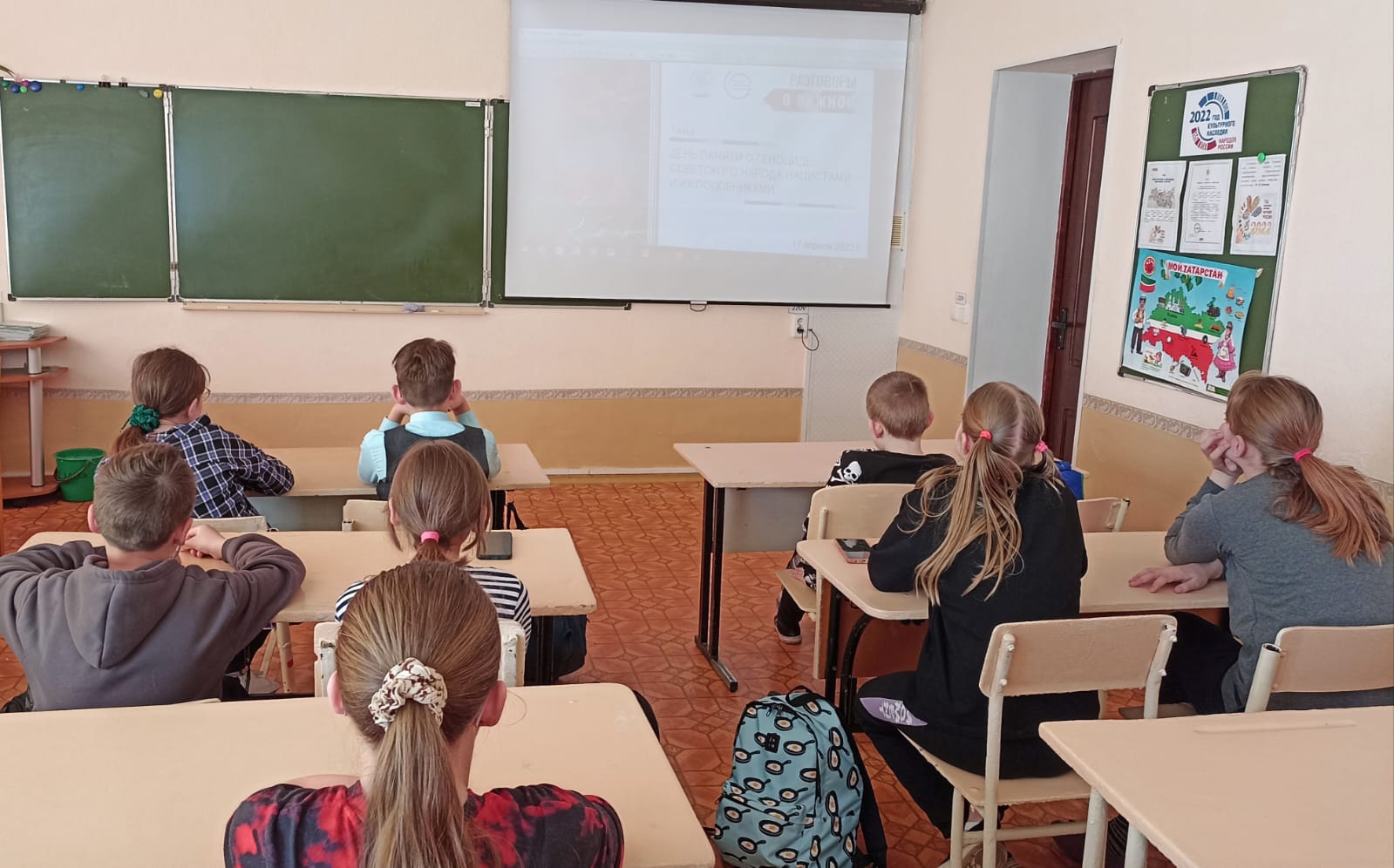 Классный руководитель, используя видеоматериал, объяснила учащимся, что такое День единых действий, когда и с какой целью он отмечается, какова его роль и значение, и в каких мероприятиях можно принять участие в этот день (19 апреля).