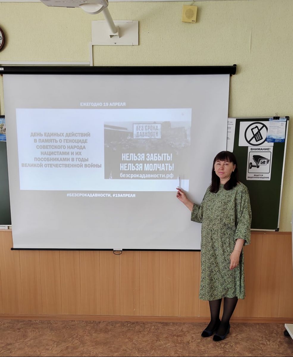 19 апреля наша школа приняла участие в проведении единого урока «Без срока давности» в рамках Дня единых действий в память о геноциде советского народа нацистами и их пособниками в годы Великой Отечественной войны. В ходе проведения мероприятия, просмотра видеофильма «Без срока давности», прохождении интерактивного блока урока, видео-квеста «Битва за Ленинград», викторины по блокаде Ленинграда, обучающиеся пришли к выводу, что у нацизма нет «светлой» стороны: местные жители оккупированных территорий подвергались массовому геноциду со стороны захватчиков. История Великой Отечественной, Второй мировой, история геноцида народов Советского Союза – это не абстрактная история, это история каждой семьи, она будет иметь значение для многих поколений наших потомков, и они тоже будут смотреть парад и военные фильмы, петь военные песни, гордиться предками и страстно желать, чтобы те страшные четыре года, которые нашим семьям и ближайшим соседям пришлось пережить, никогда не повторились. Помнить, чтобы недопустить…