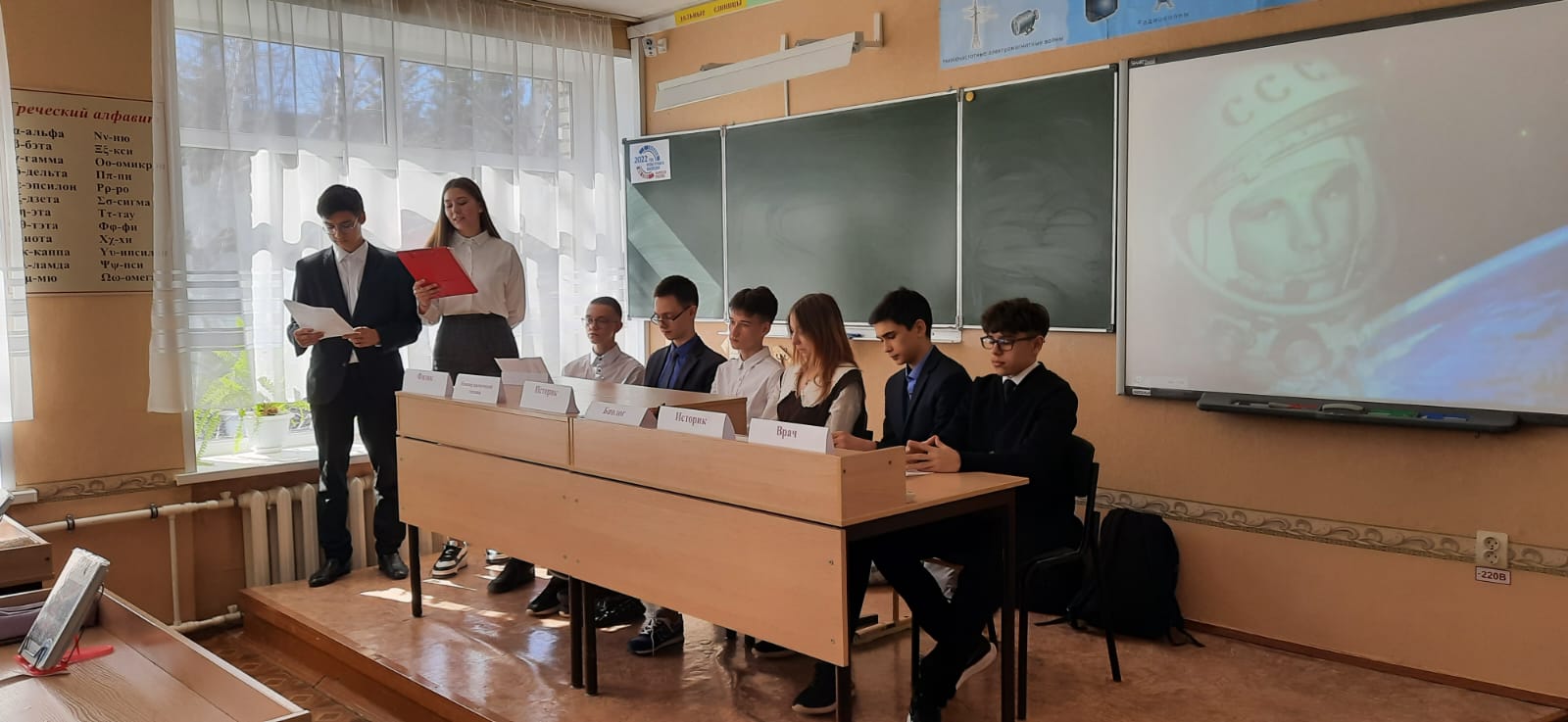 12 апреля прошёл тематический классный час в параллели 3-х классов "Гагаринский урок", посвящённый Дню Космонавтики. Учащиеся узнали какими были детские годы Юрия Гагарина. Как учителя Ю. Гагарина оказали влияние на формирование его характера. Ребята узнали какие профессии, кроме космонавта, полезны для космонавтики. Чтобы быть первым в любом деле - нужно многое знать, многому учиться. А знания дают учителя. Вот и Юрий Алексеевич Гагарин благодаря своим учителям освоил несколько профессий.Тема заинтересовала детей, у них проявился интерес к областям знаний, связанных с космосом.