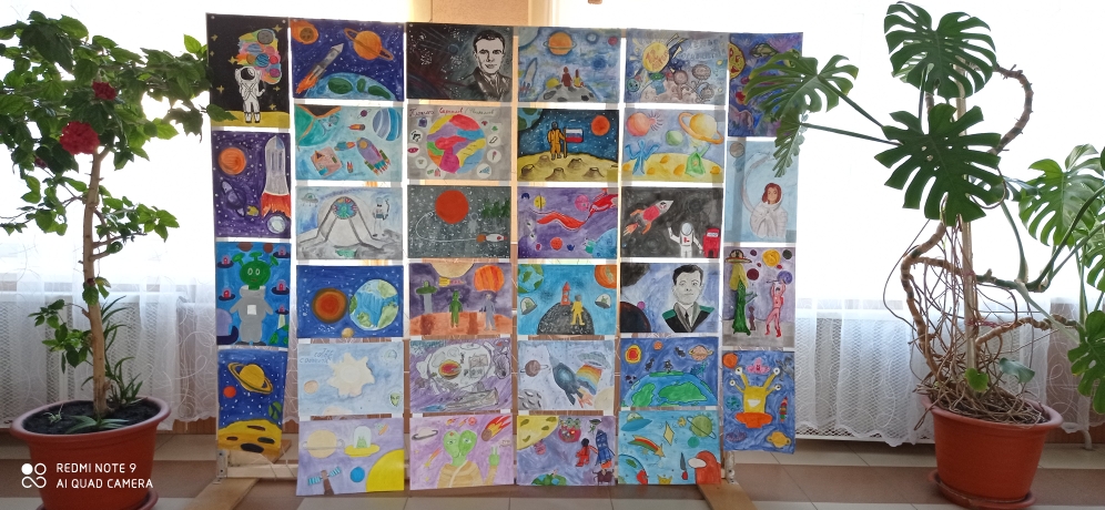 Выставка творческих работ учащихся, посвящённая Дню космонавтики.