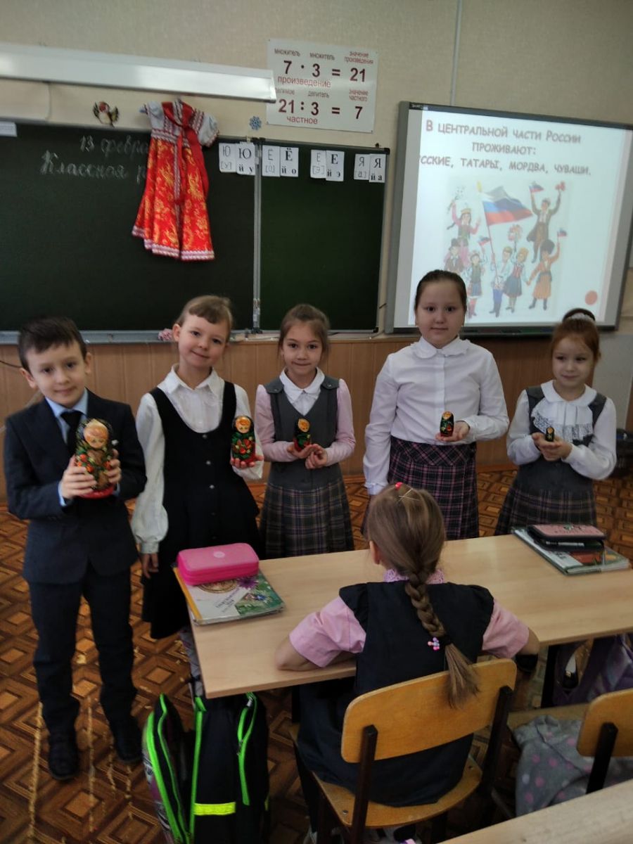 В 1Б классе прошел классный час на тему Россия в мире. Первоклассники узнали о природных богатствах и великих городах нашей Родины, о легендарных учёных и писателях. Ребята познакомились со сказками народов России. А сами малыши показали костюмы русского и татарского народов. Рассказали о русских сувенирах.