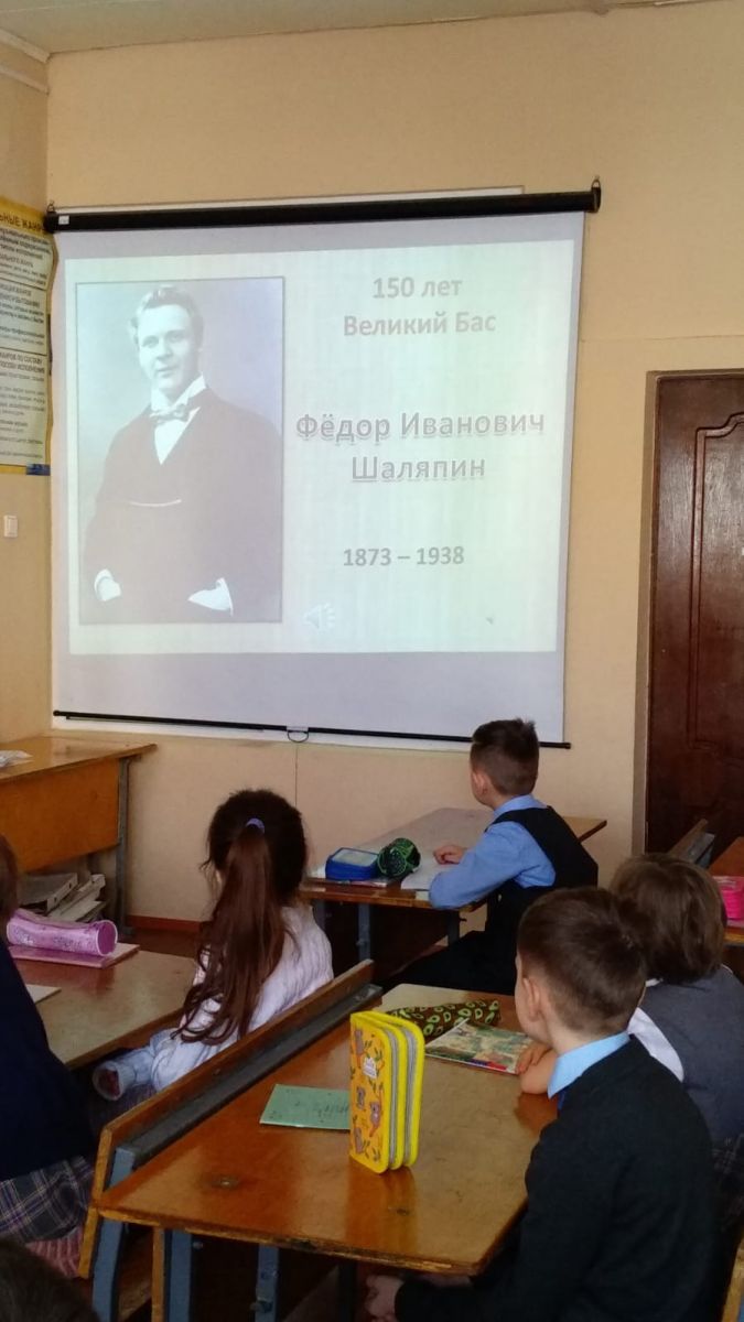 К 150 летию Фёдора Ивановича Шаляпина во вторых классах Усмановой О.В. были проведены уроки музыки. Ребята узнали как мальчик крестьянских кровей стал всемирно известным оперным басом. С интересом и трепетом второклассники послушали русские народные песни в исполнении великого земляка.