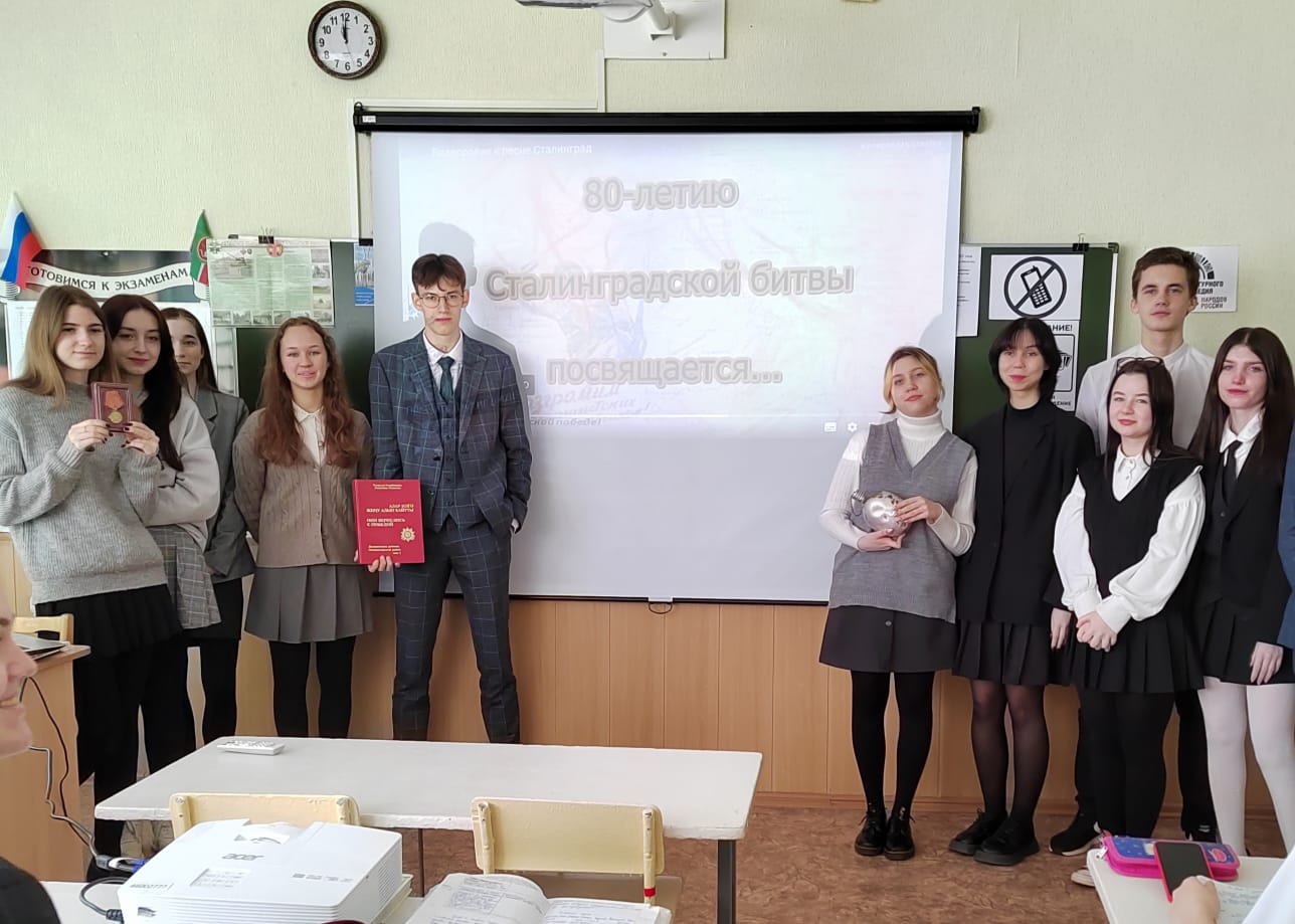 80-летию Победы в Сталинградской битве, в 10 классе на уроке истории (учитель Горшенина Н.М.), была проведена Интеллектуальная игра «Сталинградская битва», где обучающиеся проявили свою эрудицию по направлениям: даты, события, личности, культура, военные операции битвы и т.д.