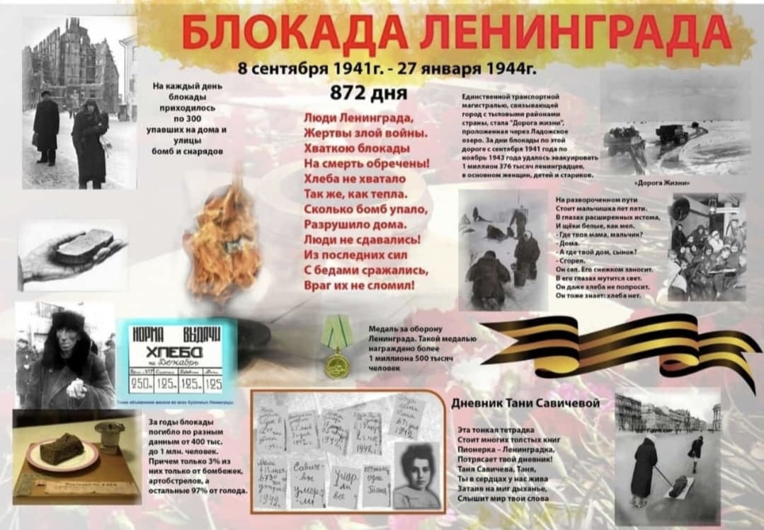 27 января 1944 года закончился один из самых трагических эпизодов Великой Отечественной войны. Была полностью снята блокада Ленинграда, которая продолжалась 872 дня. Ленинград — единственный в мировой истории город, который смог выдержать почти 900-дневное окружение. В честь этого события сегодня были проведены Уроки мужества, викторины, беседы-презентации и просмотры фильмов о войне.