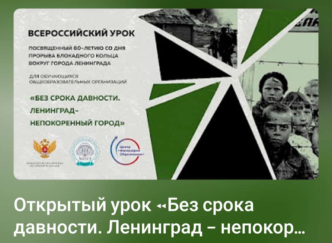 27 января 2023 года в 10-11 классах в рамках Всероссийский акции, посвященной Дню полного освобождения Ленинграда от фашистской блокады прошел урок "Без срока давности". Ребята просмотрели и обсудили видеоматериалы " Ленинград - непокоренный народ", которые никого не оставили равнодушными.