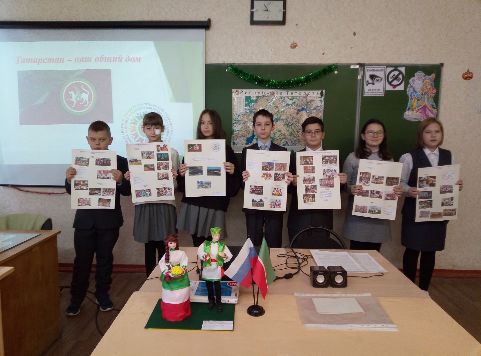 В рамках Года родных языков и народного единства в Республике Татарстан в 5В классе (учитель Маслакова Г.Я.) прошло внеклассное мероприятие под названием «Татарстан – наш общий дом». Мероприятие было направлено на развитие интереса у учащихся к культуре и традиции народов, проживающих в нашей республике, воспитанию уважения к родному языку и языкам народов Поволжья. В ходе мероприятия учащиеся вспомнили основные традиции татарского и русского народов, а также познакомились с историей и культурой таких народностей, как башкиры, удмурты, чуваши, мордва и марийцы. Завершилось мероприятие выполнением проектной работы: изготовление альбома «Культура и традиции народов Татарстана».
