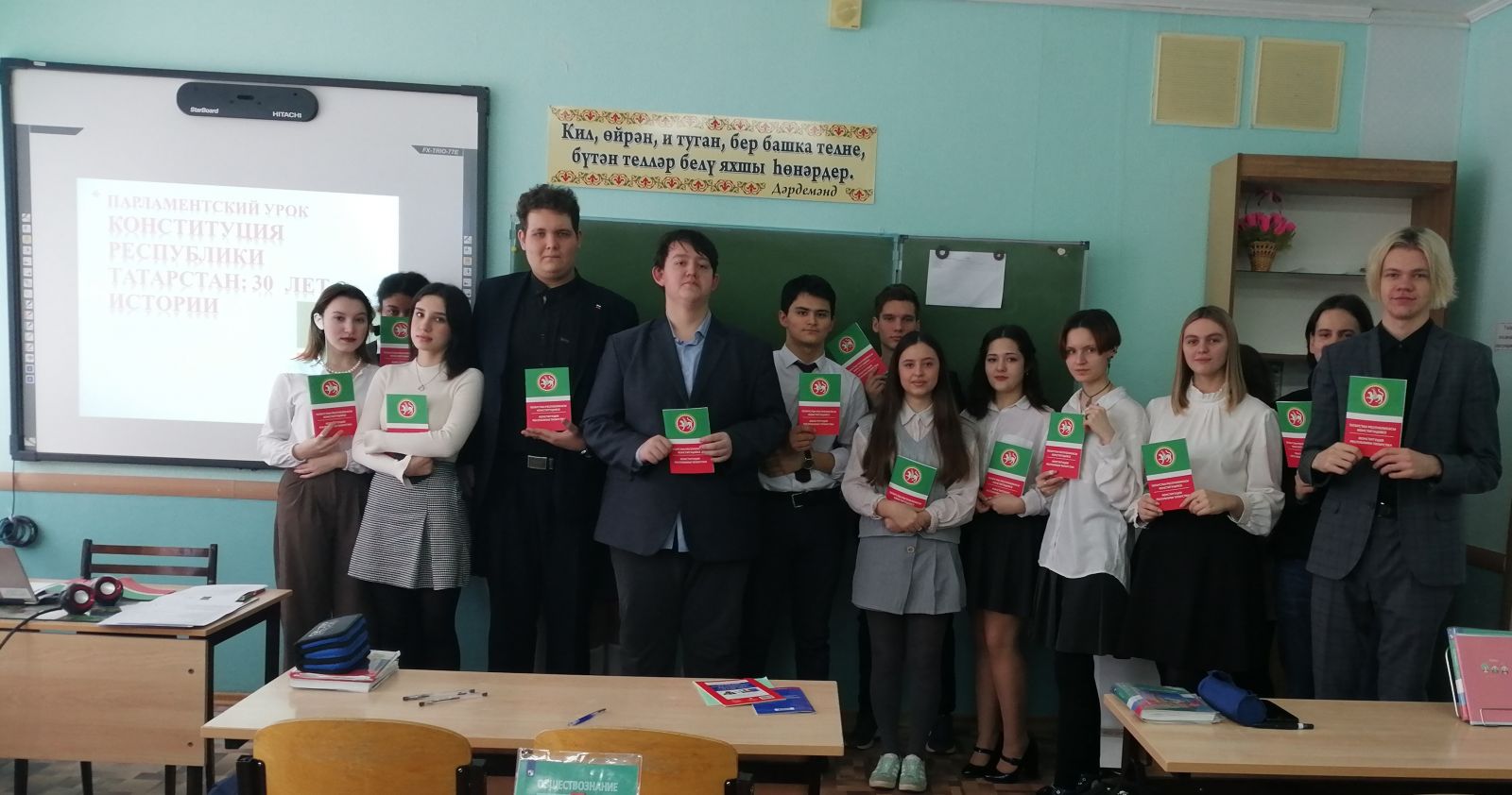 8 февраля в рамках муниципальной недели «История в школе», в 11 классе был проведен Парламентский урок, посвященный 30 – летию со дня принятия Конституции Республики Татарстан на тему: «Я – гражданин! Мои права и обязанности». Выпускники вспомнили краткую историю Республики Татарстан, ее культуру, современные достижения, просмотрев видеофильм, а затем в форме брейн-ринга ответили на вопросы, изучая источник - Конституцию Республики Татарстан. Мероприятие носило соревновательный дух. Цель данного мероприятия: воспитание правовой грамотности обучающихся, формирование коммуникативных умений школьников, ценностное осмысление роли Конституции – главного правового документа.