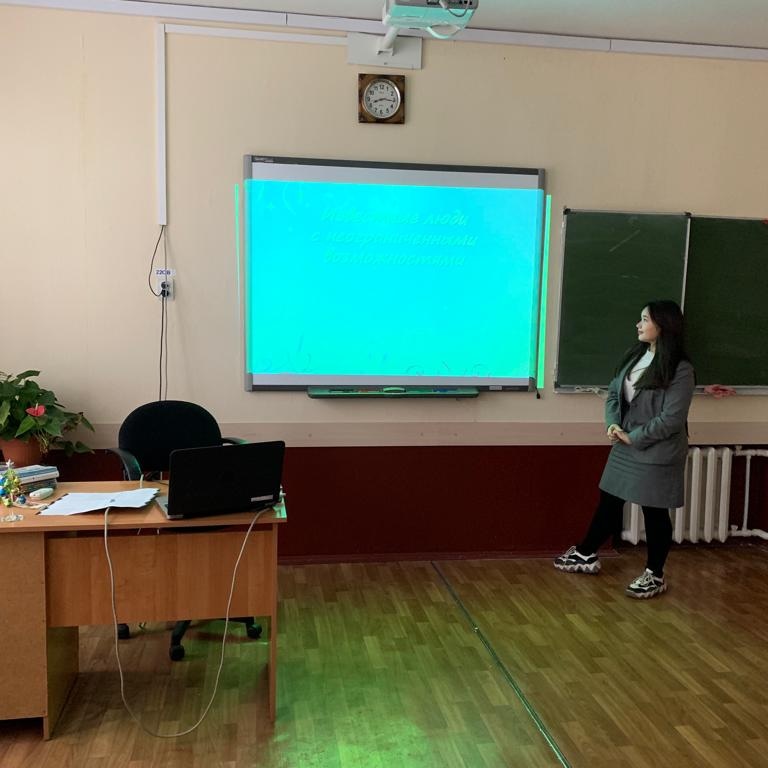 9 декабря в рамках Недели Добра в 7А классе прошёл классный час, посвящённый Дню Инвалида. Учащиеся познакомились с проблемами людей имеющих ограниченные возможности. А также посмотрели презентацию о том, чего способны достичь люди с ограниченными возможностями.