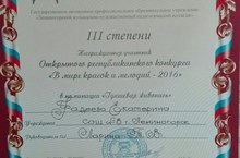 22 апреля в Лениногорском музыкально- художественном колледже проводился Открытый республиканский конкурс "В мире красок и мелодий - 2016 год" , в котором приняли участие ученицы 10 а класса нашей школы: Манакова Ольга (Учитель музыки Тюхтеев М.М.) и Фадеева Екатерина (учитель МХК Ларина Т.В.). Поздравляем Екатерину с победой в номинации "Гуашевая живопись" занявшая достойное 3 место. Молодцы! Желаем успехов и побед в конкурсах.