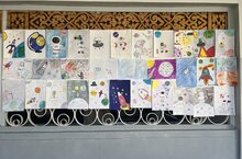 В холле школы проходит выставка рисунков, посвящённая 65-летию первого полёта Юрия Гагарина в космос.