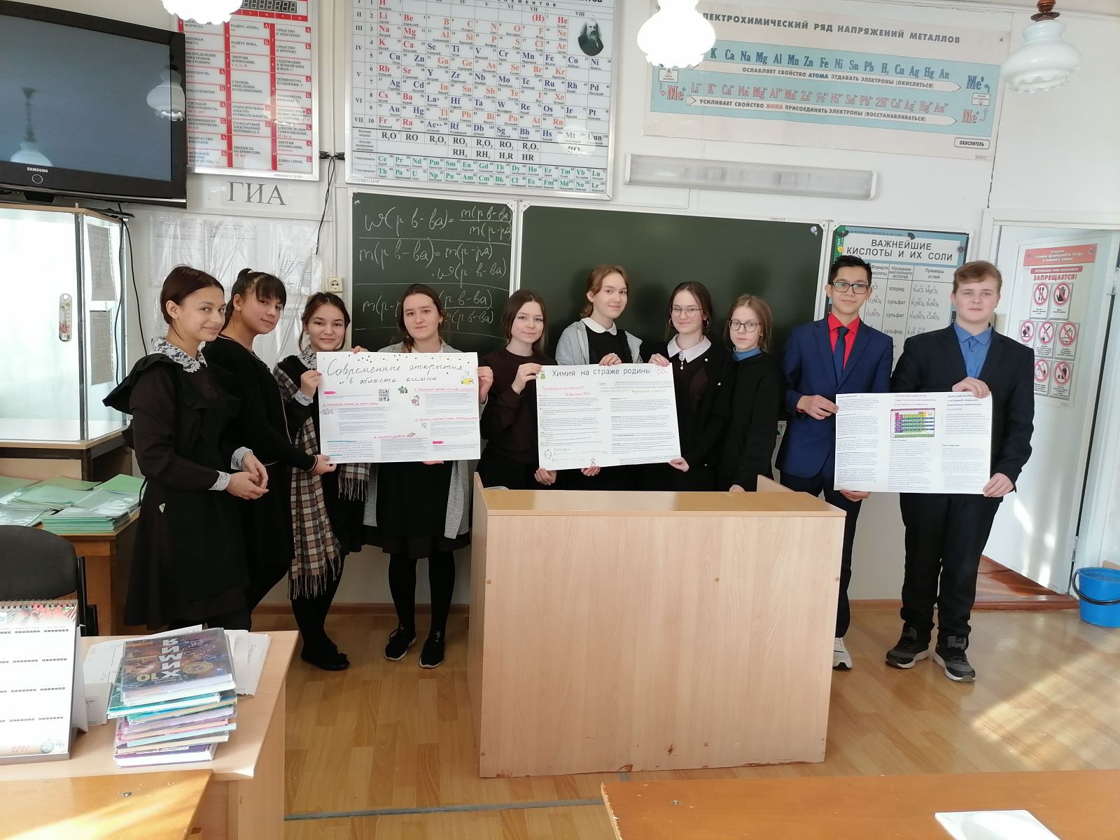 Учащиеся 10б класса защитили свои проекты перед целевой аудиторией. Темы проектов: "Химия на страже Родины", "Современные открытия в области химии", "История открытия химических элементов".