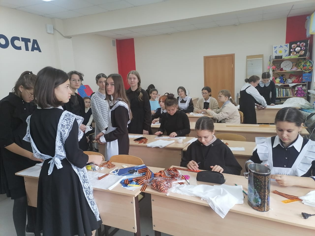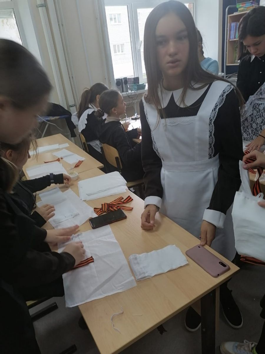 В рамках сетевого взаимодействия кружков “Проектирование в социальной среде” и “Технология и дизайн” учащиеся шьют белые повязки солдатам российской армии.