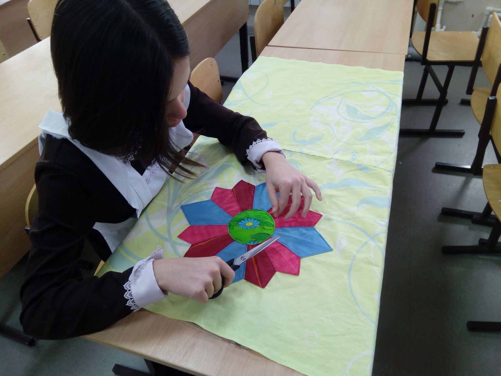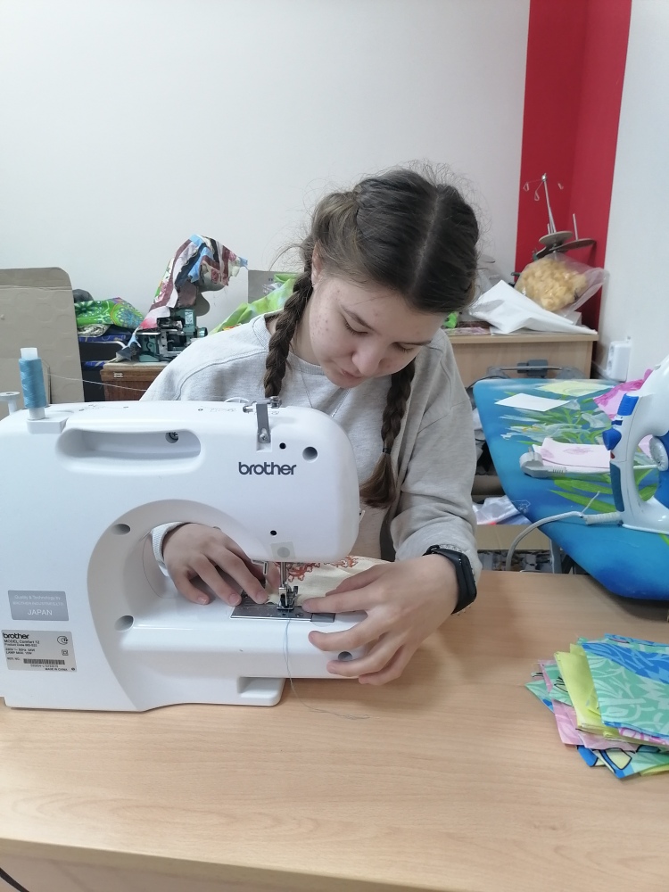 Продолжается совместная интегрированная работа в объединениях "Технология и дизайн" и "Проектирование в социальной среде" над бизибордом. Девочки работают в группах, создавая составные части - фрагментов проекта.