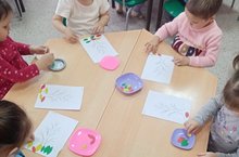 Учим детей создавать рельефные изображения из пластилина модульным способом - отщипывать кусочки, прикладывать к фону и прикреплять (прижимать, примазывать) пальчиками из кусочков пластилина разного цвета (синий, белый). Техника деления пластилина на части (общипывание, отрывание, откручивание).