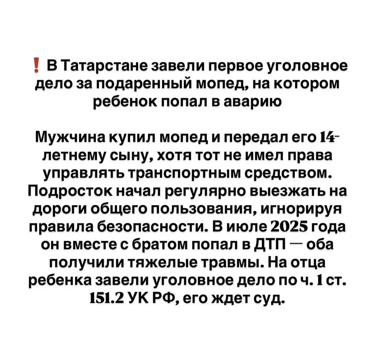 Уважаемые родители! Если ваши несовершеннолетние дети будут кататься на пит байках мопедах мотоциклах и в случаи получения ими увечья на родителей будет возбуждаться уголовное дело. Независимо знали вы либо не знали, что он тайком поехал кататься либо как это бывает « взял ключи без спроса», будет уголовная ответственность. Статья предусматривает лишение свободы. -
