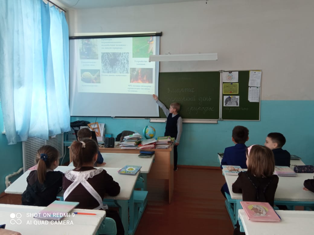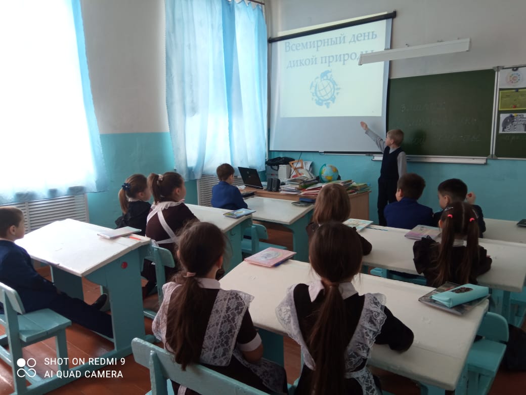 Сегодня в школе прошло внеклассное мероприятие, посвященное этой дате. Учитель биологии Ахметова Ф.А. рассказала учащимся о деятельности Союза охраны дикой природы, об истории возникновения этой даты. Учащиеся просмотрели презентацию "Всемирный день дикой природы".